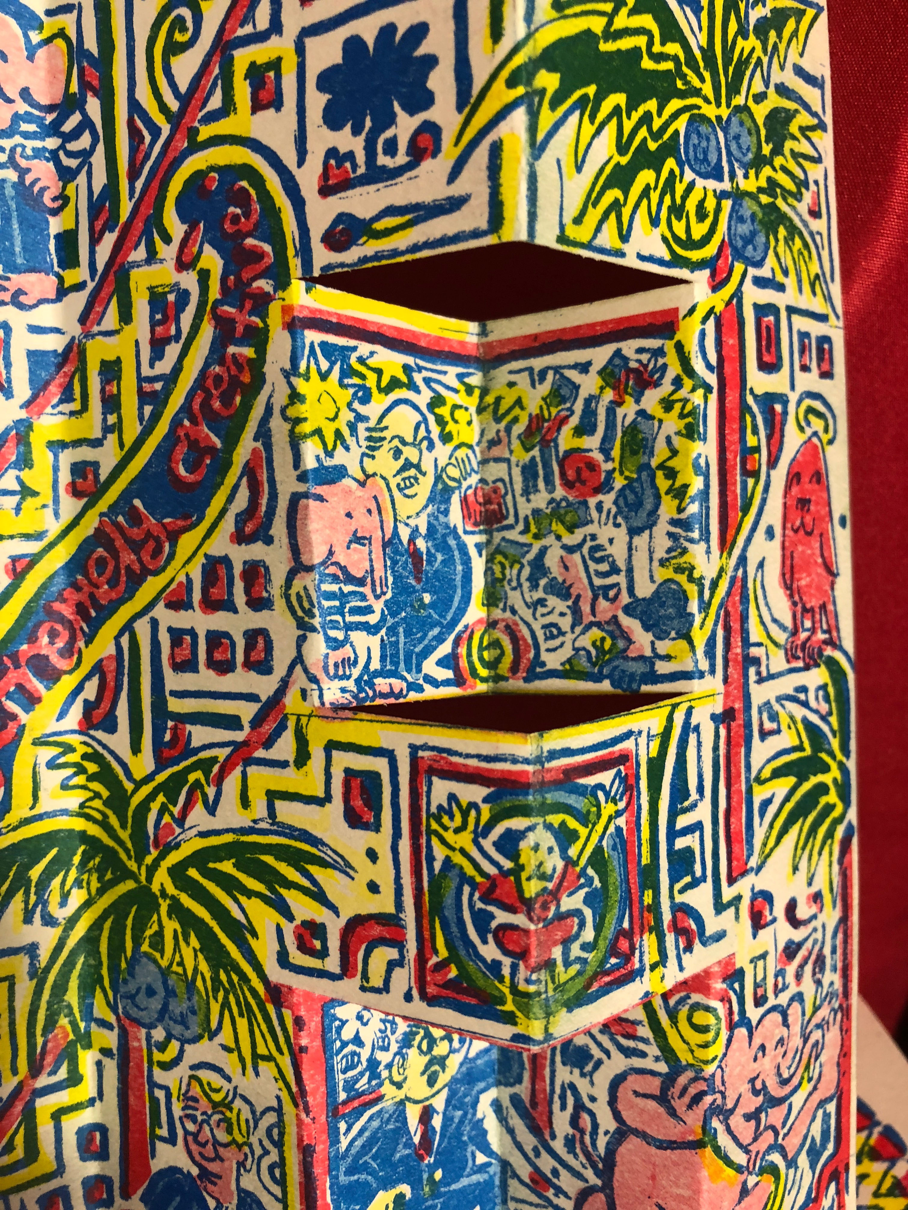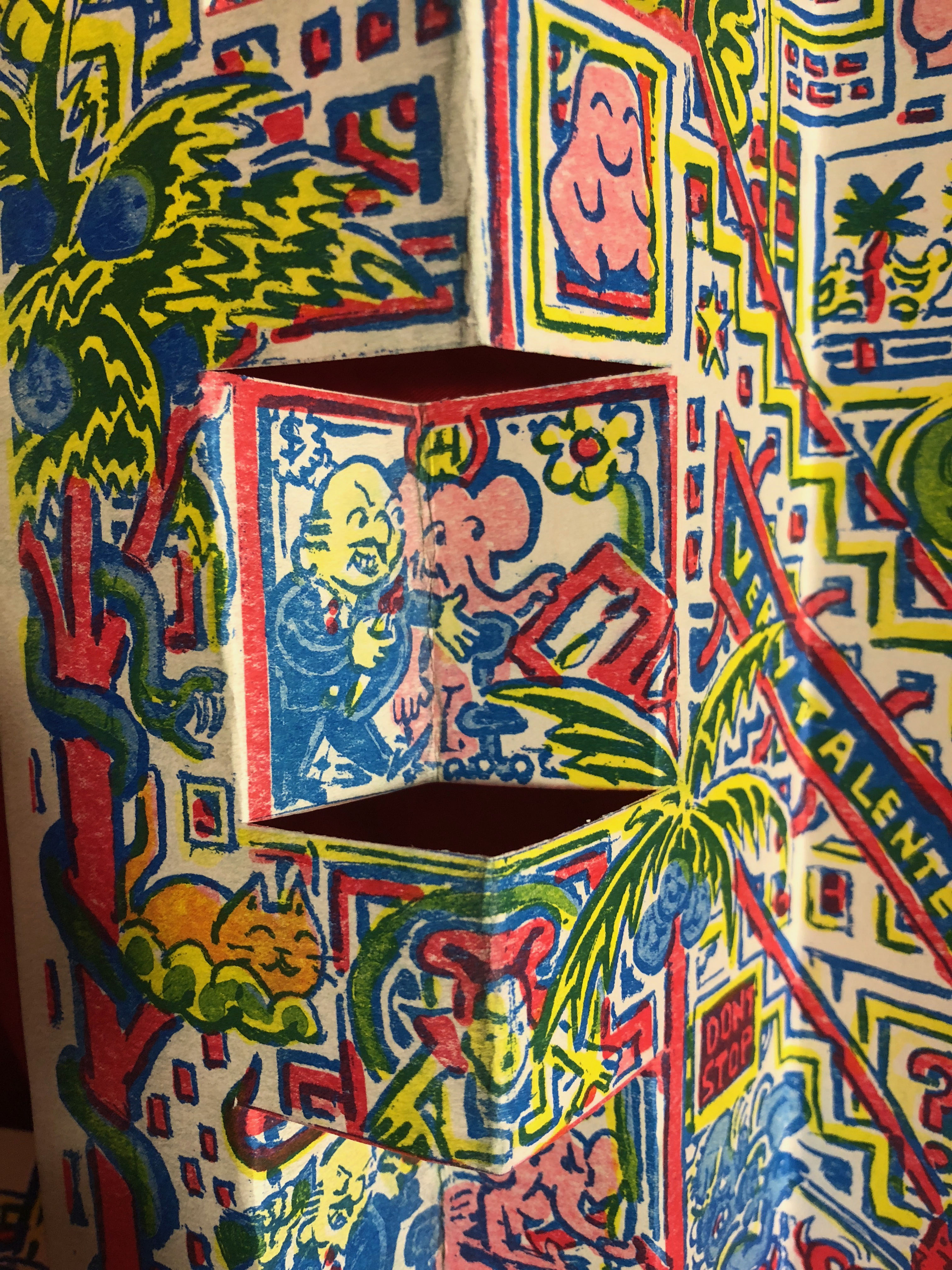 11"x17" (flat) 3 color risograph pop-up print. A heartwarming tale of artistic liberation portrayed in a pop-up fold-out format wherein each panel of the 9 panel comic strip is recessed into its own pop-in cubby. Can stand on a surface, be hung on a nail or thumbtack, put in fancy shadow box frame, up to you.