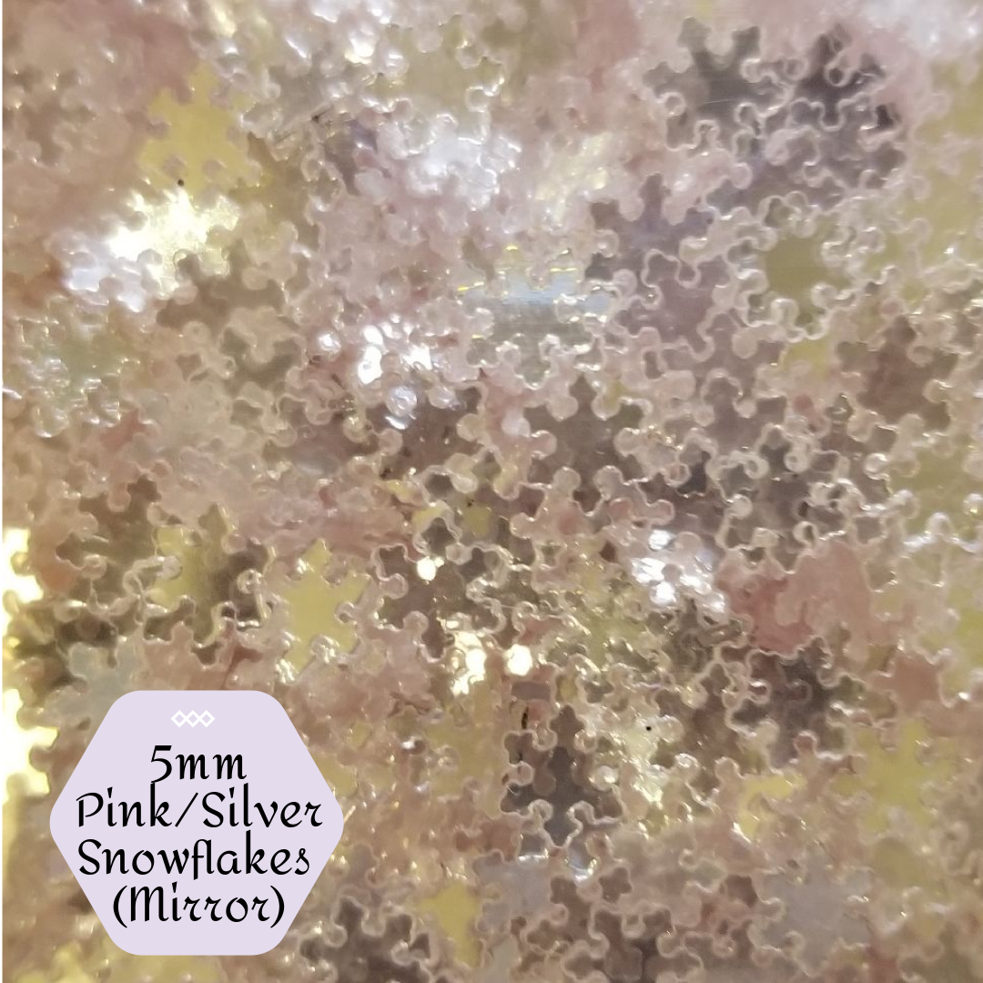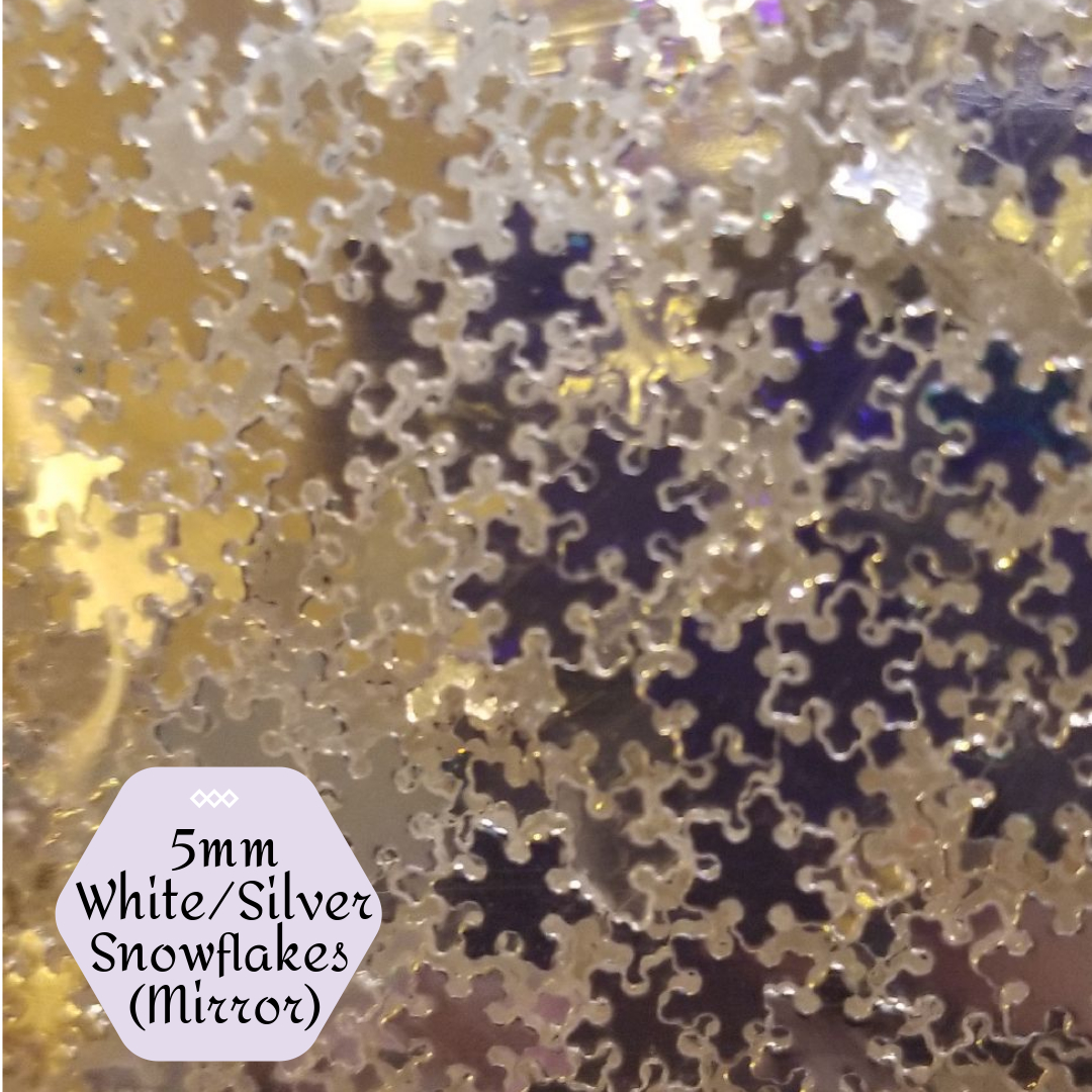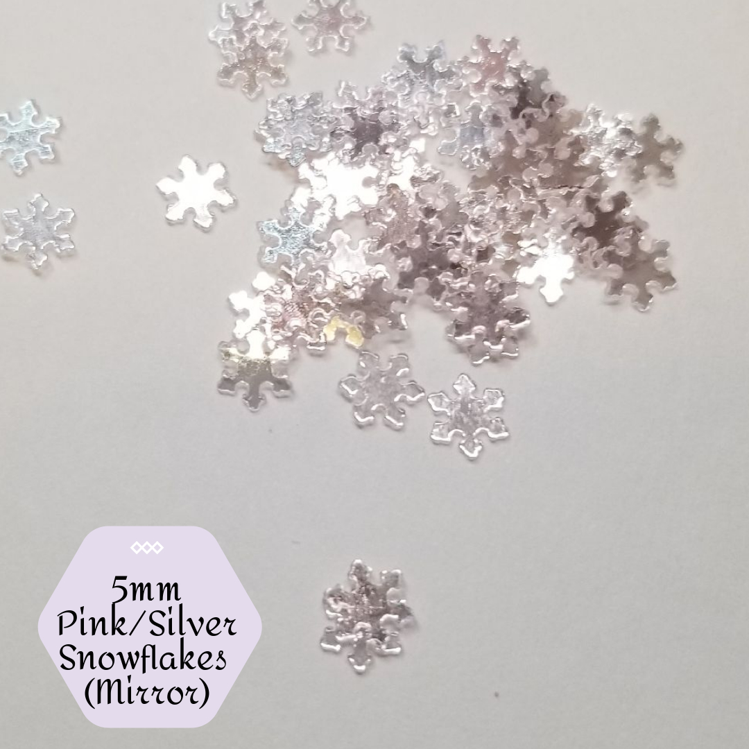 Tiny snowflake spangles perfect for Christmas and Winter themed nail art, slime, tumblers, shaker cards and other crafts. These snowflakes are in a mirror/silver finish. 5mm Size: 1.5 (tsp) or half a Tablespoon (seasonal item)