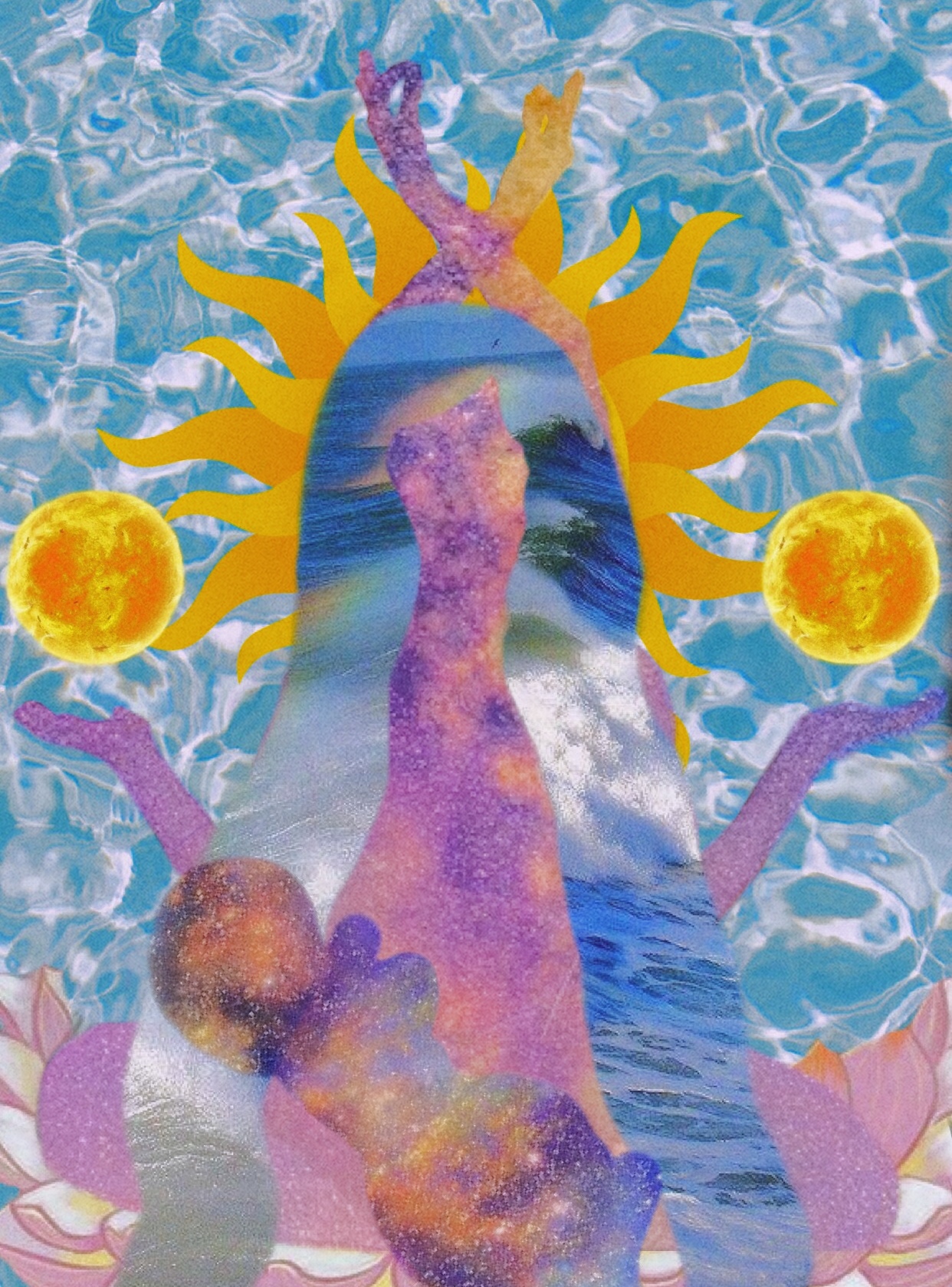 MAI MAH YAH is a symbolic piece. being a mother as a being is a whole universe in and of itself, she births child universes and nourishes them. two suns in her hands, representative of the sun's energy always being one that will move us towards shining, towards embracing our natural talents and gifts, to share our power with the word, in turn enlivening our communities. sun energy being one to inspire whenever we are sad, not motivated, lacking direction. ocean waves as her hair to symbolize how we must always stay fluid and flexible throughout our lives to reach the easiest ways to make decisions. going with the flow and never agaisnt to make proper use of all the forces of creation available and present. bigger sizes available, for larger/custom order, please email me at [email protected]. please allow one to two weeks for processing, delivery, and arrival.