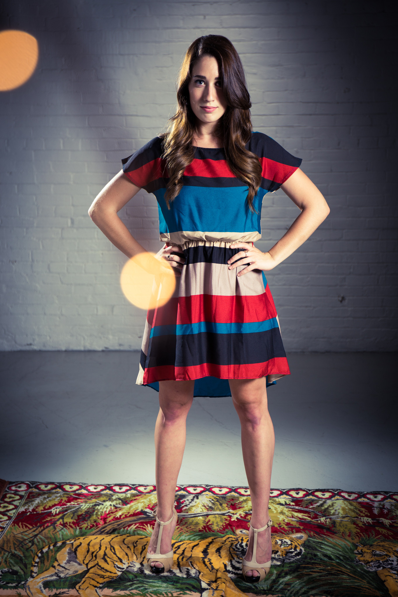 Striped hi-low dress with short sleeves. It might have pockets. I can't remember May come with surprise pockets! Update: no pockets. 100% polyester with 100% polyester lining