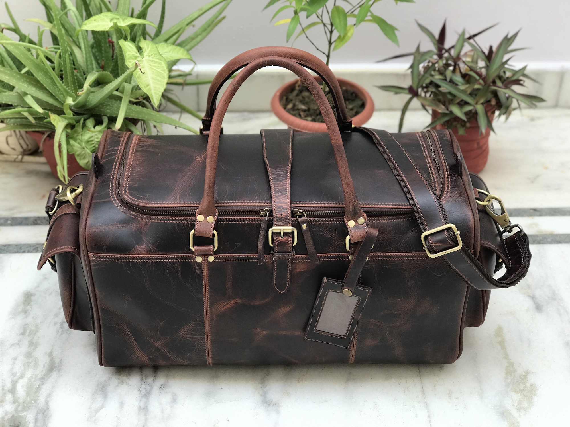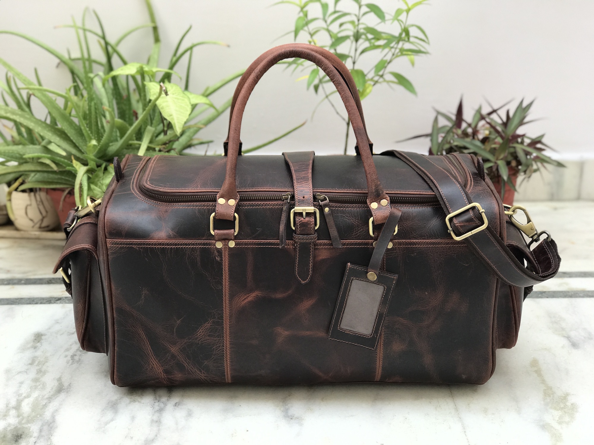 This Leather Weekend Bag comes with extra top strap to put extra strength on bag. Bag is protected with round bottom metal studs from scratches at base. Over Body Belt Strap for more strength to overall bag; Length: 41cms/16 inches. Main big compartment with ample space for keeping your clothes and essentials.