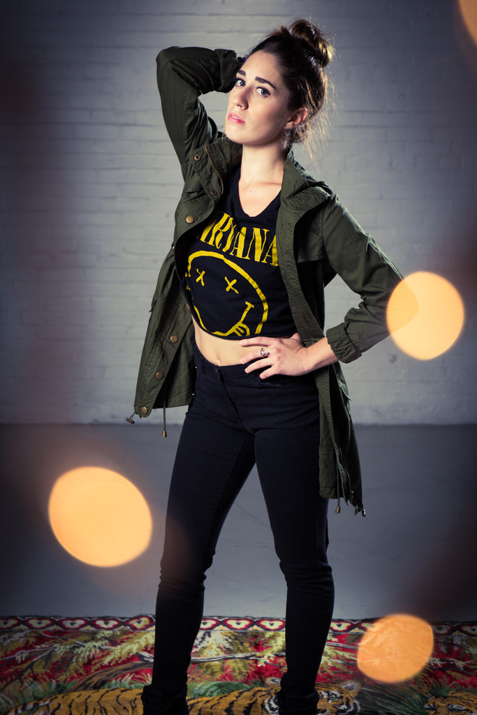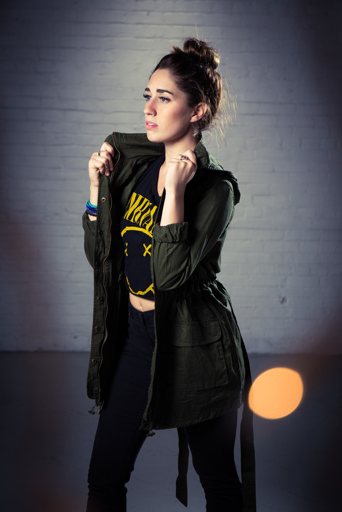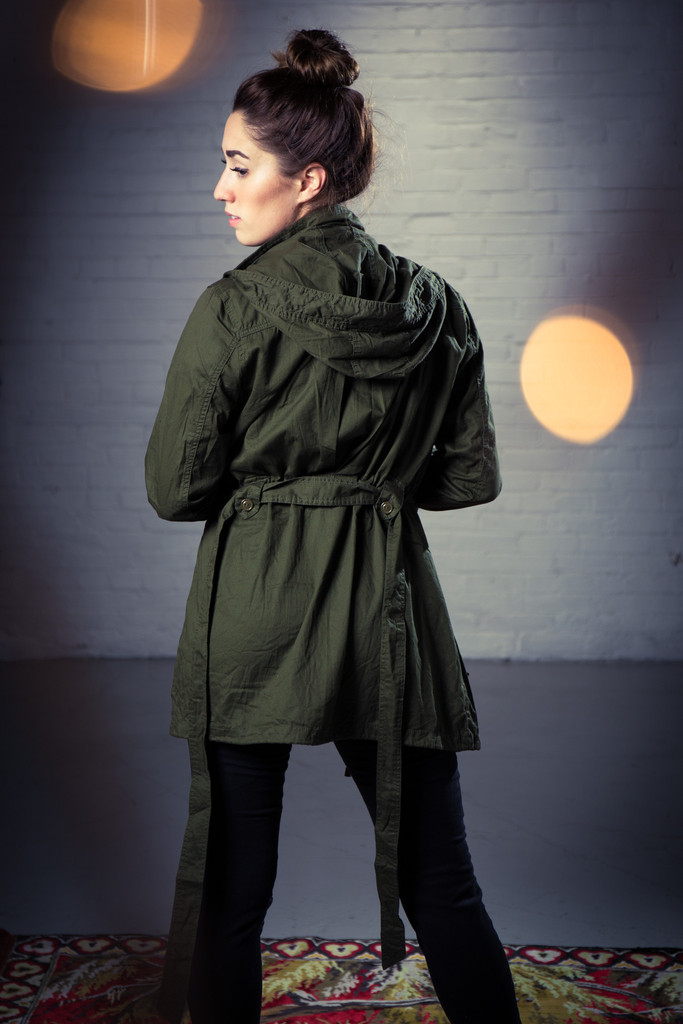 Uncle Sam has style (model's name is "Uncle Sam." Weird, we know.) Longline military green jacket with belt. Zips and snaps. Two pockets. One hood.