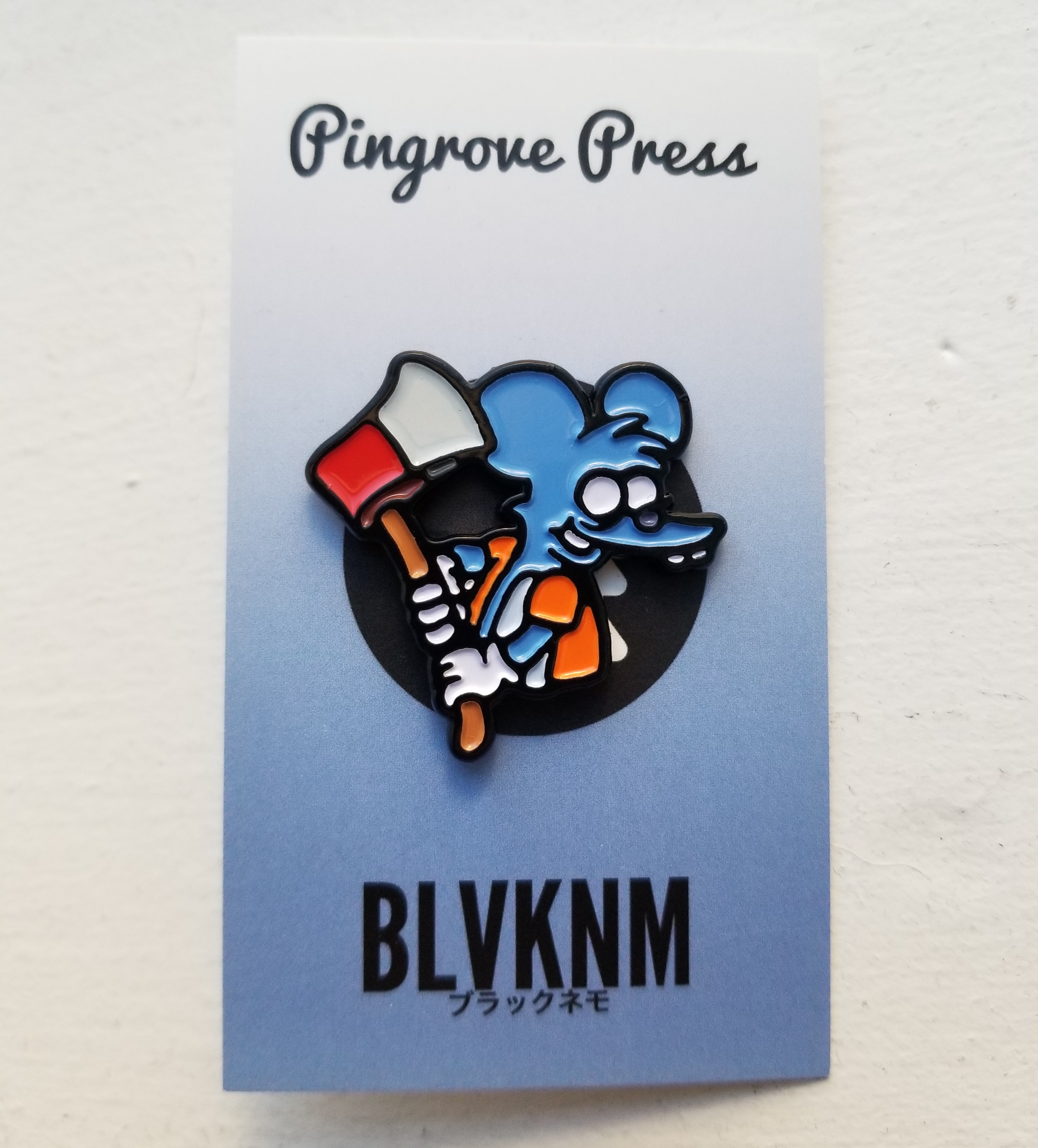 Itchy (むずむず). Collaboration with BLVNKM Clothing. 35mm, soft enamel, with two rubber-clutch backings. Pins are individually packaged with a custom backing card and a cellophane bag. https://blvknm.com/ https://www.instagram.com/blvknm.clthng/ https://www.facebook.com/blvknm/ Hand-numbered, limited edition of 50. Pins will ship in a bubble mailer. All orders include a free Pingrove Press button.