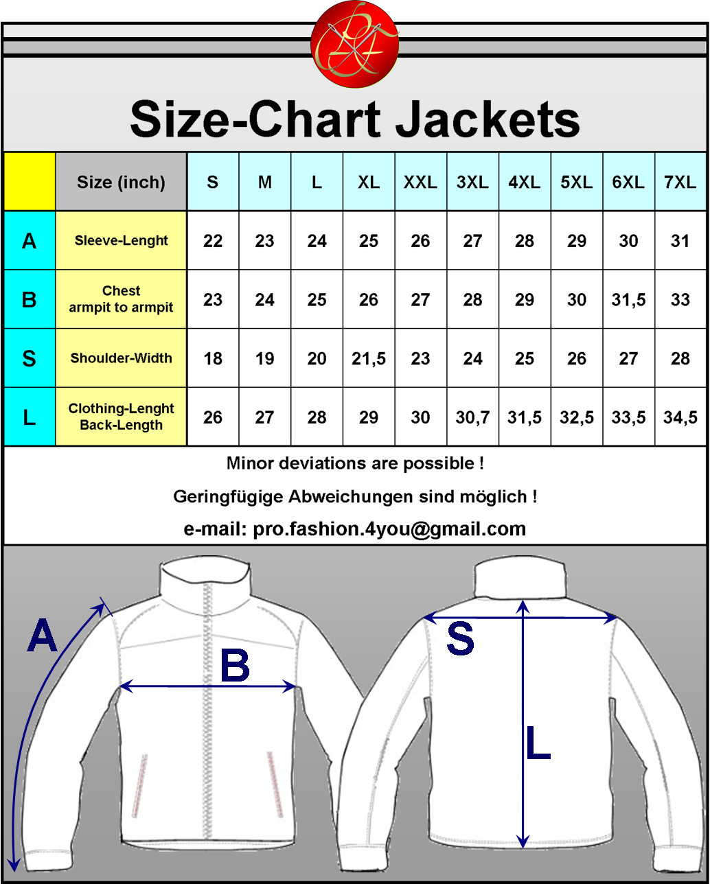 Please take one of your clothes that suits you well, measure and then compare with our size charts. Measure your jacket (clothes), not your body !