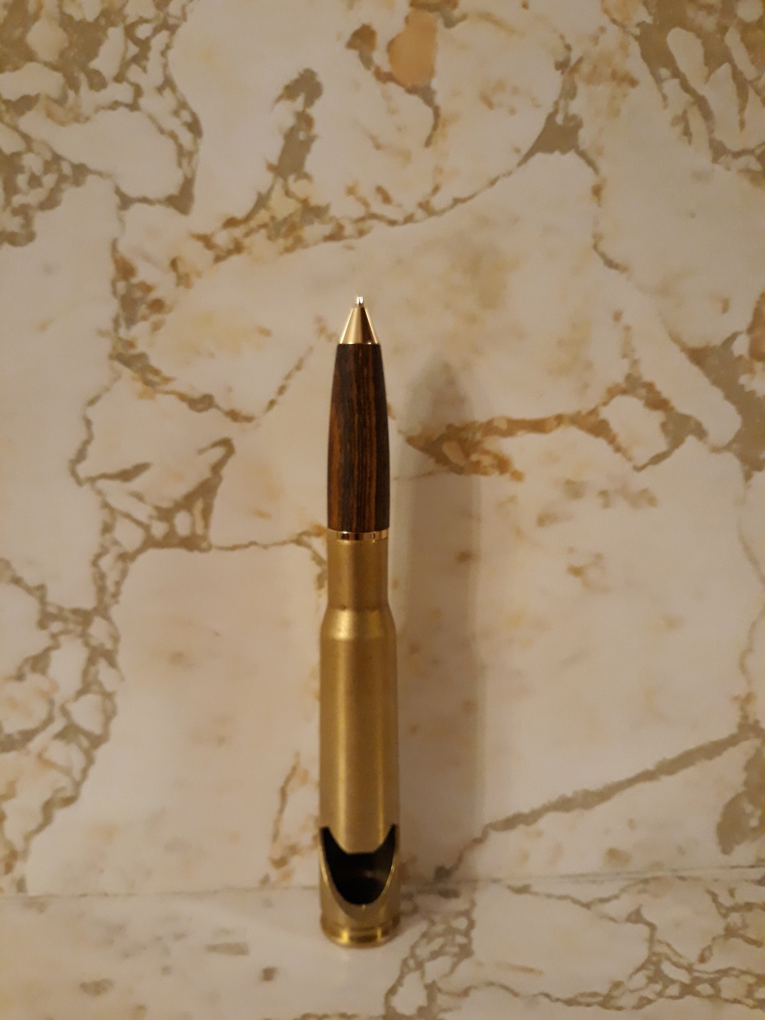 Pen made from 50 Caliber brass and hand-cut wood. Works as a bottle opener and twist pen! *7.1 percent sales tax included with purchases made in Utah.