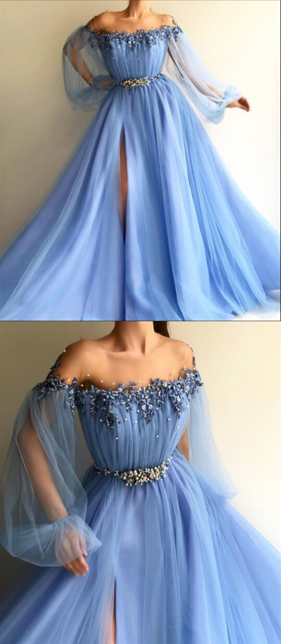 Custom Made Round Neck Baby Blue Tulle Long Sleeves Prom Dresses, Blue Long Sleeves Formal Dresses-1