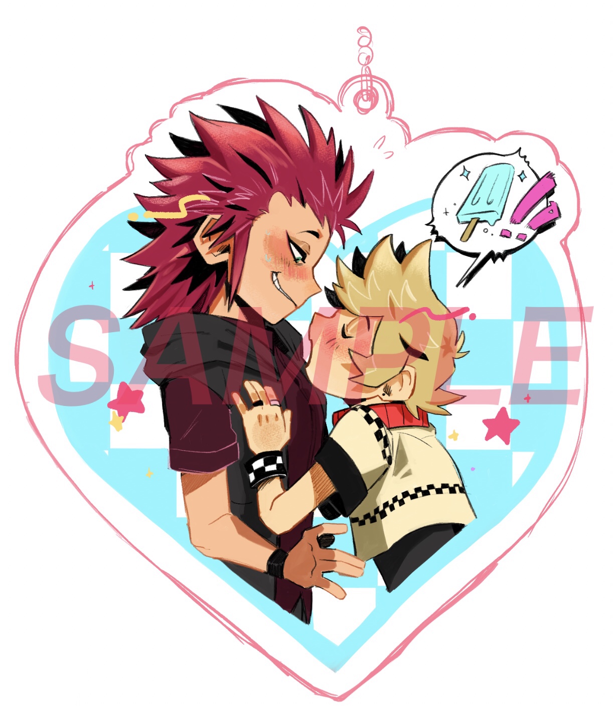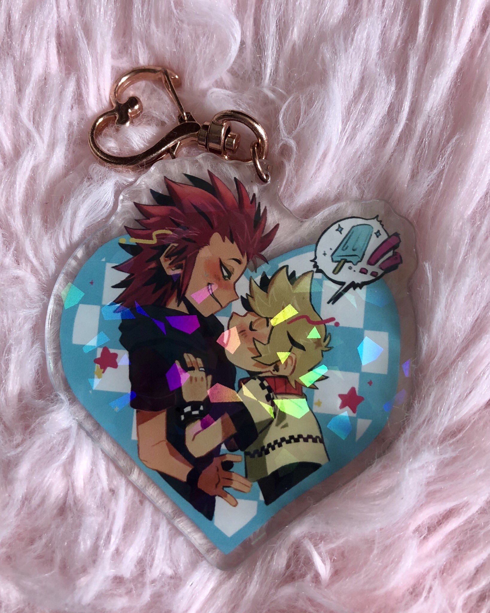 3 inch clear acrylic charm featuring Axel and Roxas from Kingdom Hearts. Double sided with holo foil and a rose gold heart lobster clasp.