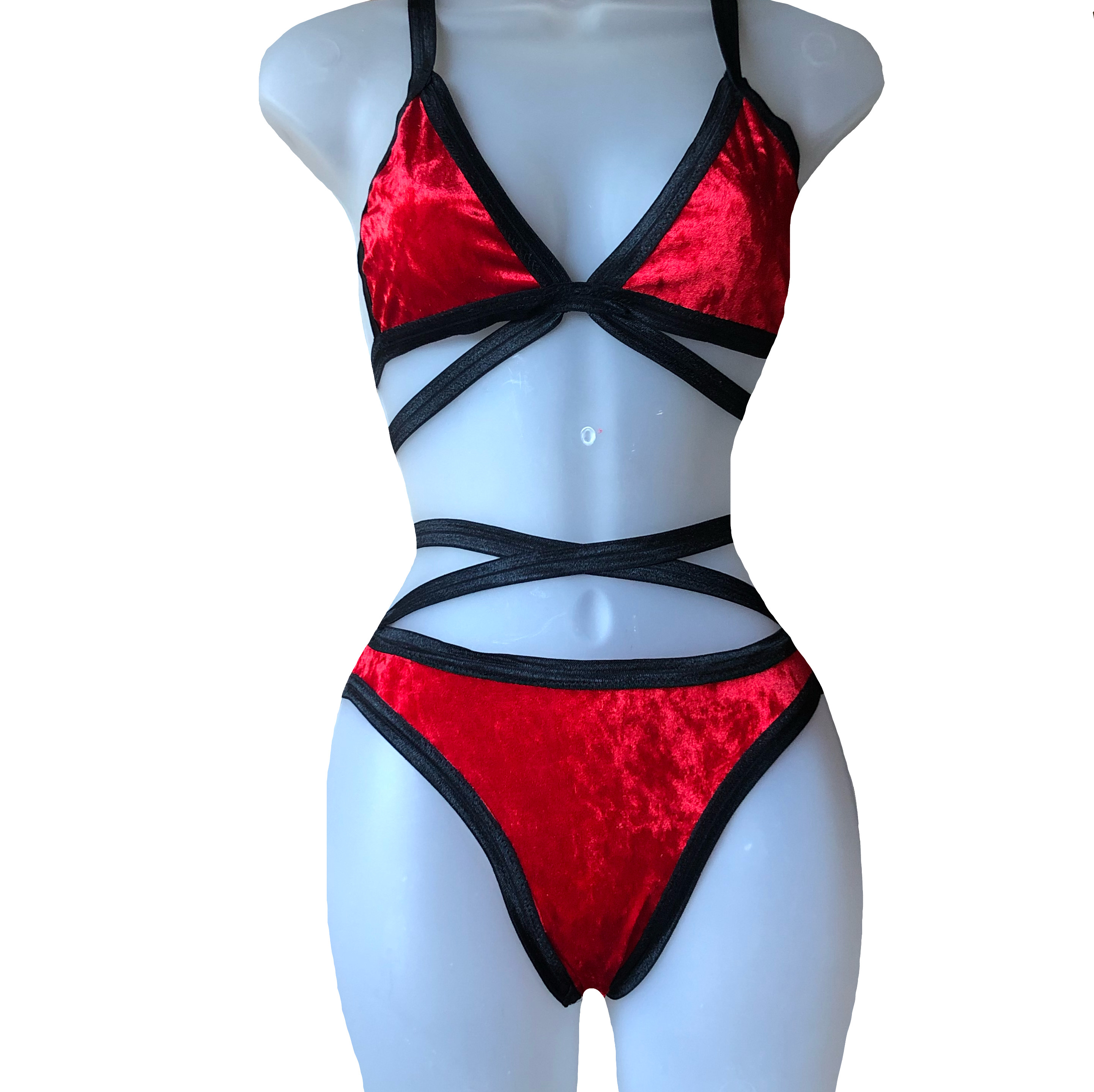 Soft and stretchy set made out of a red panne crushed velvet. Lounge around the house in this set or wear it any day! Size Measurements Bralette XSmall: bust 28”-30” Small: bust 32”-34” Medium: bust 36”-38” Large: bust 40”-42” XLarge: bust 44”-46” Panty XSmall: waist 22”-28” Small: waist 26”-32” Medium: waist 30”-36” Large: waist 34”-40” XLarge: waist 38”-44”