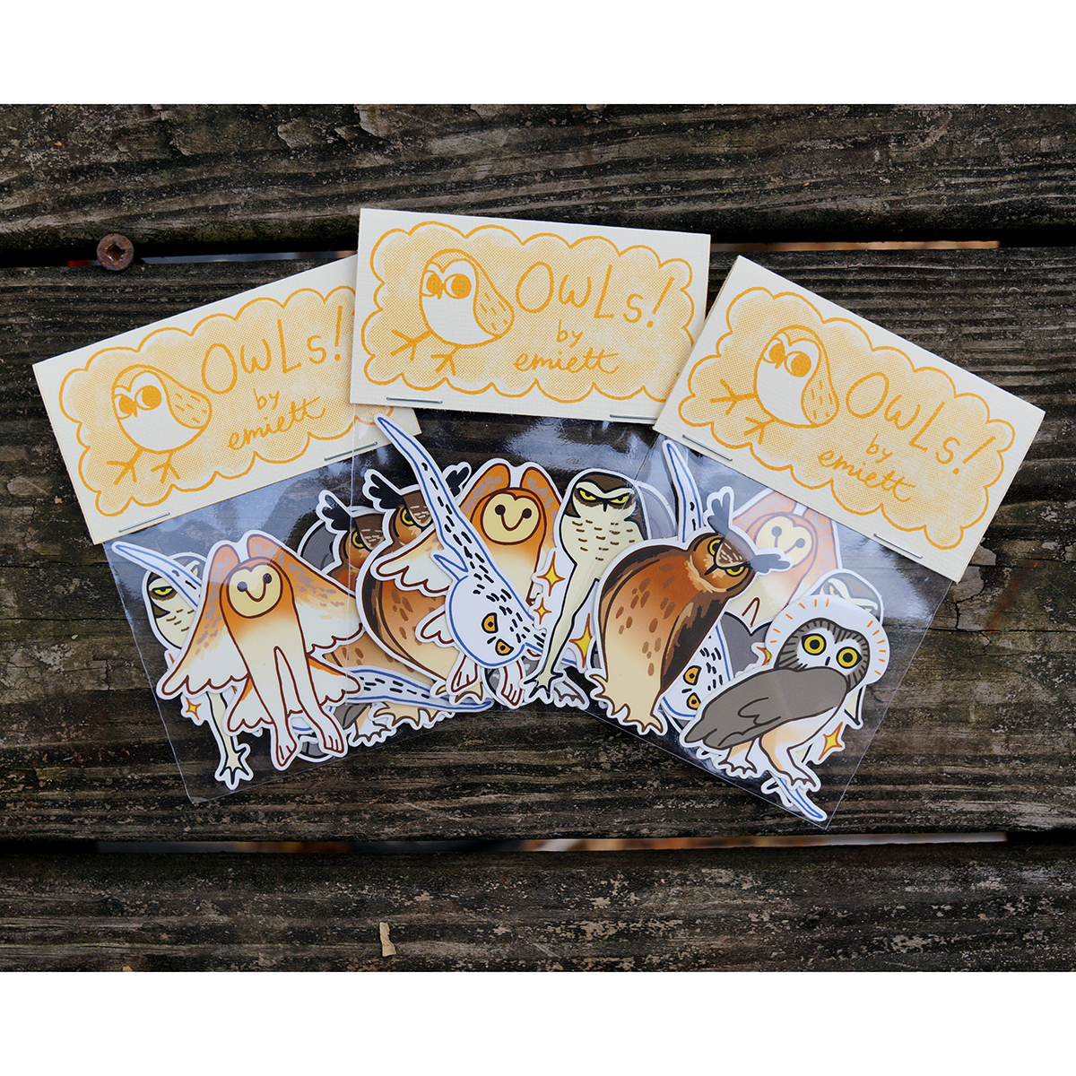 Enjoy 6 amazing, talented owls! This pack includes a snowy owl, great gray owl, burrowing owl, barn owl, great horned owl, and a saw-whet owl! These stickers are matte vinyl. Stickers are packaged in a stapled paper and a compostable PLA clear bag. Shipped in a reinforced flat mailer.