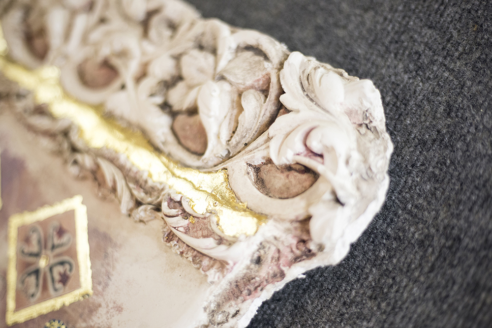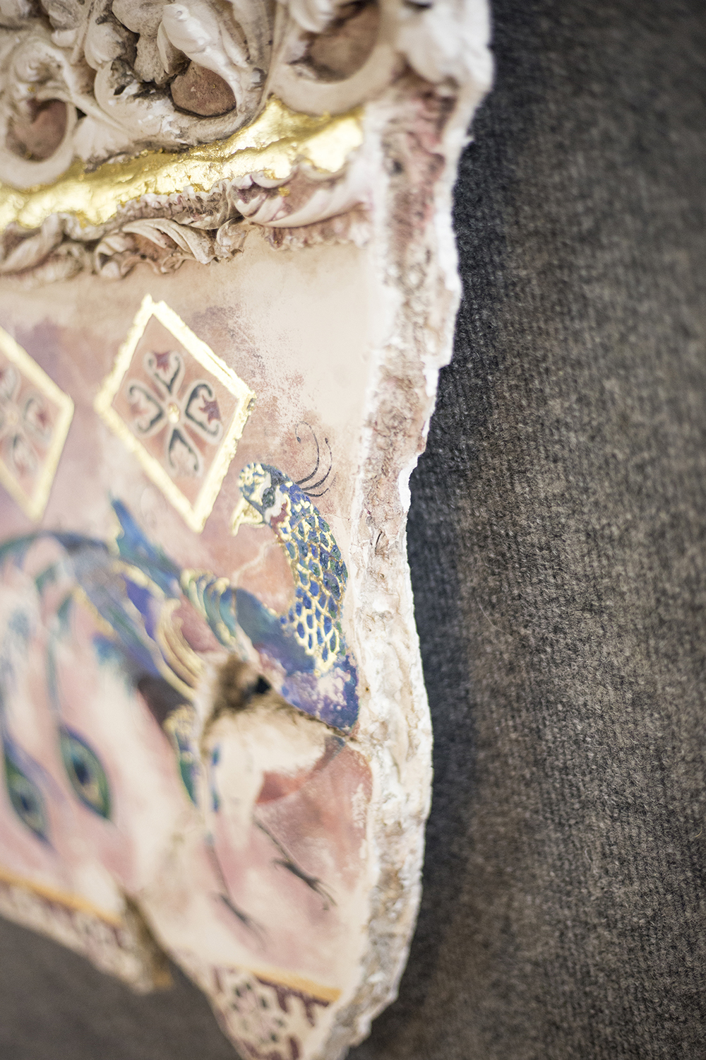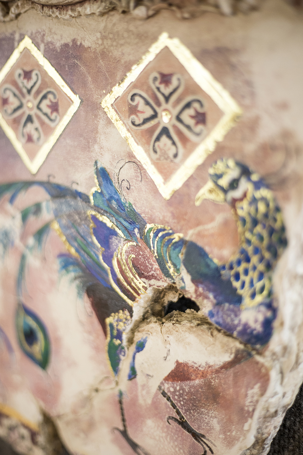 It combines fresco, sculpture, molding techniques and materials science. After much experimenting, I am satisfied with my custom recipe for this plaster type mixture for its strength, color retention, surface texture, and relatively lightweight of about 6.5 lbs. Wooden bars attached to the back makes hanging super simple.