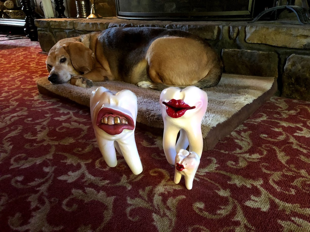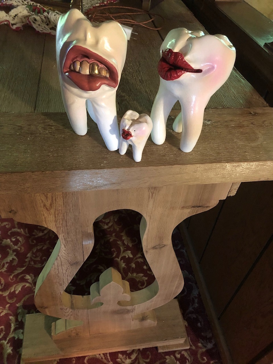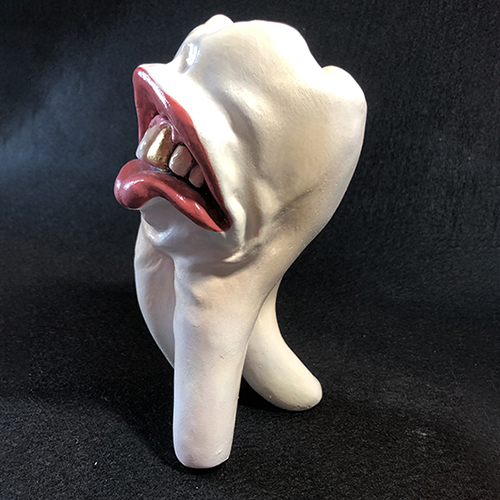 "Bad Mouth" From the Monster Molar limited art series - is a big boy at 2.5 pounds, 7 inches tall, 13 inches around. As an artist, I have tremendous fun with these sculptures. They are an expression of my quirky humor and love of theatrical arts. I think of them as art pieces as well as expressive stone puppets. I acquired my knowledge of tooth anatomy working as an Oral Surgeons assistant. I have also always worked as a professional artist. Witness these two worlds colliding resulting in collateral smiles. I sculpted them from clay, made a silicone mold so that I could cast them in sturdy hydro stone. I meticulously hand sand, paint and seal each one. (smiling all the while) I sign each piece at the furcation of the roots under the crown surface. I enjoy placing them in different situations around their environments. They are sturdy enough for the yard, the house, or office, and love the cameras attention for social media memes. These little works of art make wonderful gifts. For some weird reason, it’s fun to pick them up and hold their surprising weight in your hands. Recently I find adding little touches to their enamel wardrobe even more expressive. I hope you will enjoy them as much as I do. I hope to see them around the Net as you create your own little mascots, memes, and unique displays.
