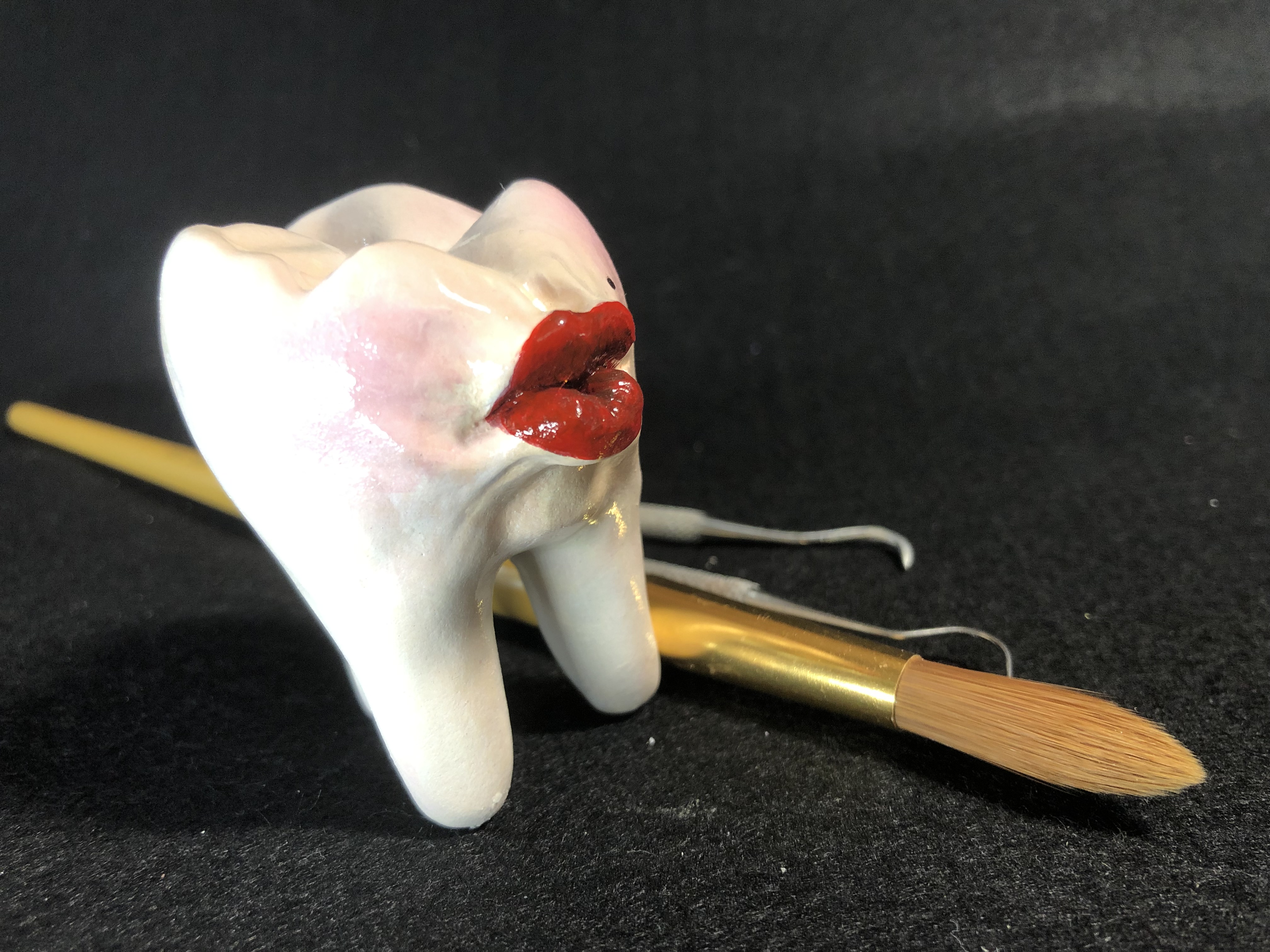 Tiny but sexy, "Pearly Pucker" is from the mighty molar original art series. she stands 2.5in tall, weighs 4oz and comes in a beautiful custom glam gold box perfect for gift-giving. As an artist, I have tremendous fun with these sculptures. They are an expression of my quirky humor and love of theatrical arts. I think of them as art pieces as well as expressive stone puppets. I acquired my knowledge of tooth anatomy working as an Oral Surgeons assistant. I have also always worked as a professional artist. Witness these two worlds colliding resulting in collateral smiles. I sculpted them from clay, made a silicone mold so that I could cast them in sturdy hydro stone. I meticulously hand sand, paint and seal each one. (smiling all the while) I sign each piece at the furcation of the roots under the crown surface. I enjoy placing them in different situations around their environments. They are sturdy enough for the yard, the house, or office, and love the cameras attention for social media memes. These little works of art make wonderful gifts. For some weird reason, it’s fun to pick them up and hold their surprising weight in your hands. Recently I find adding little touches to their enamel wardrobe even more expressive. I hope you will enjoy them as much as I do. I hope to see them around the Net as you create your own little mascots, memes, and unique displays.