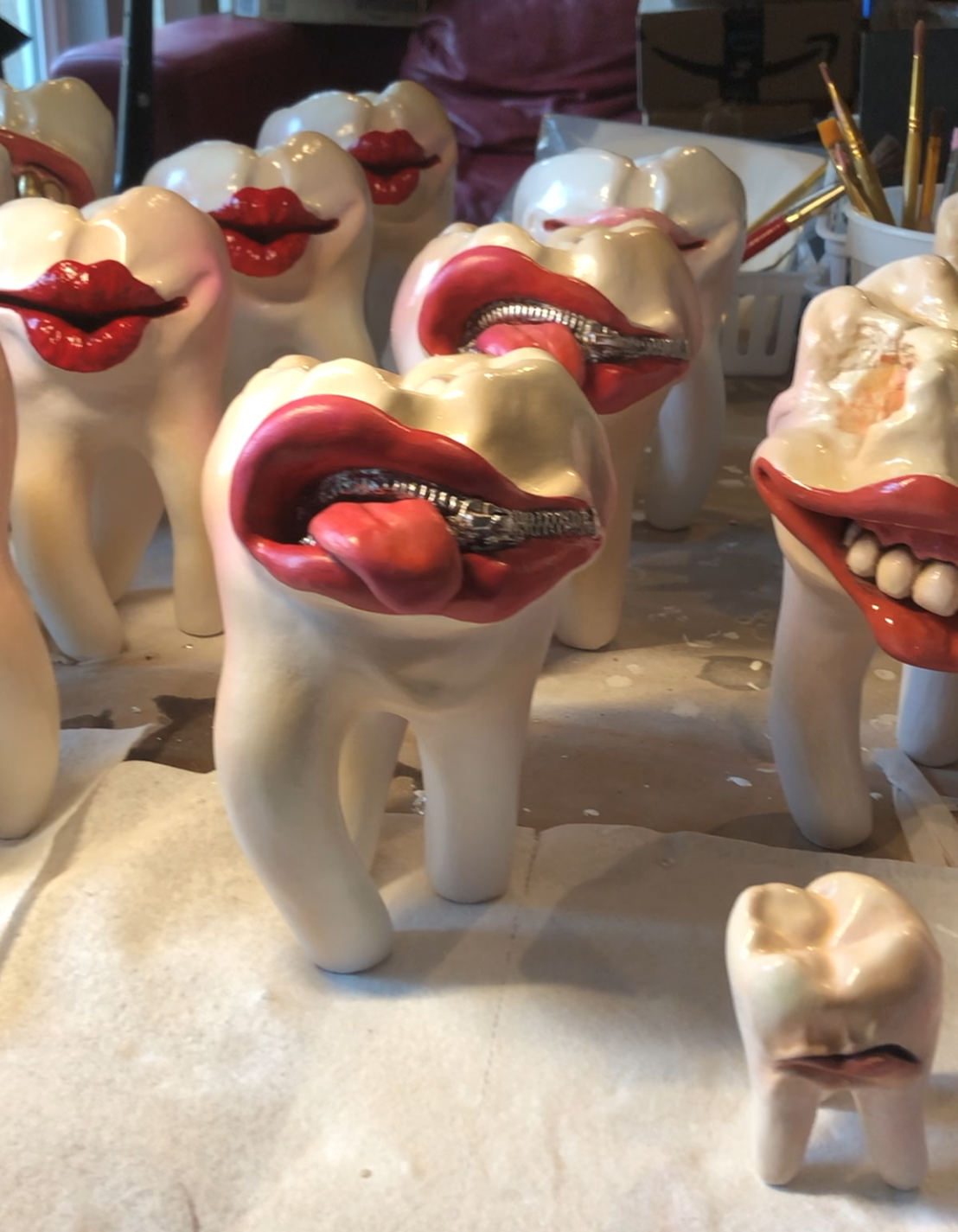 Tiny but mighty, "Mad Masticator" is from the mighty molar original art series. He stands 2.5in tall, weighs 4oz and comes in a beautiful custom glam gold box perfect for gift-giving. As an artist, I have tremendous fun with these sculptures. They are an expression of my quirky humor and love of theatrical arts. I think of them as art pieces as well as expressive stone puppets. I acquired my knowledge of tooth anatomy working as an Oral Surgeons assistant. I have also always worked as a professional artist. Witness these two worlds colliding resulting in collateral smiles. I sculpted them from clay, made a silicone mold so that I could cast them in sturdy hydro stone. I meticulously hand sand, paint and seal each one. (smiling all the while) I sign each piece at the furcation of the roots under the crown surface. I enjoy placing them in different situations around their environments. They are sturdy enough for the yard, the house, or office, and love the cameras attention for social media memes. These little works of art make wonderful gifts. For some weird reason, it’s fun to pick them up and hold their surprising weight in your hands. Recently I find adding little touches to their enamel wardrobe even more expressive. I hope you will enjoy them as much as I do. I hope to see them around the Net as you create your own little mascots, memes, and unique displays.