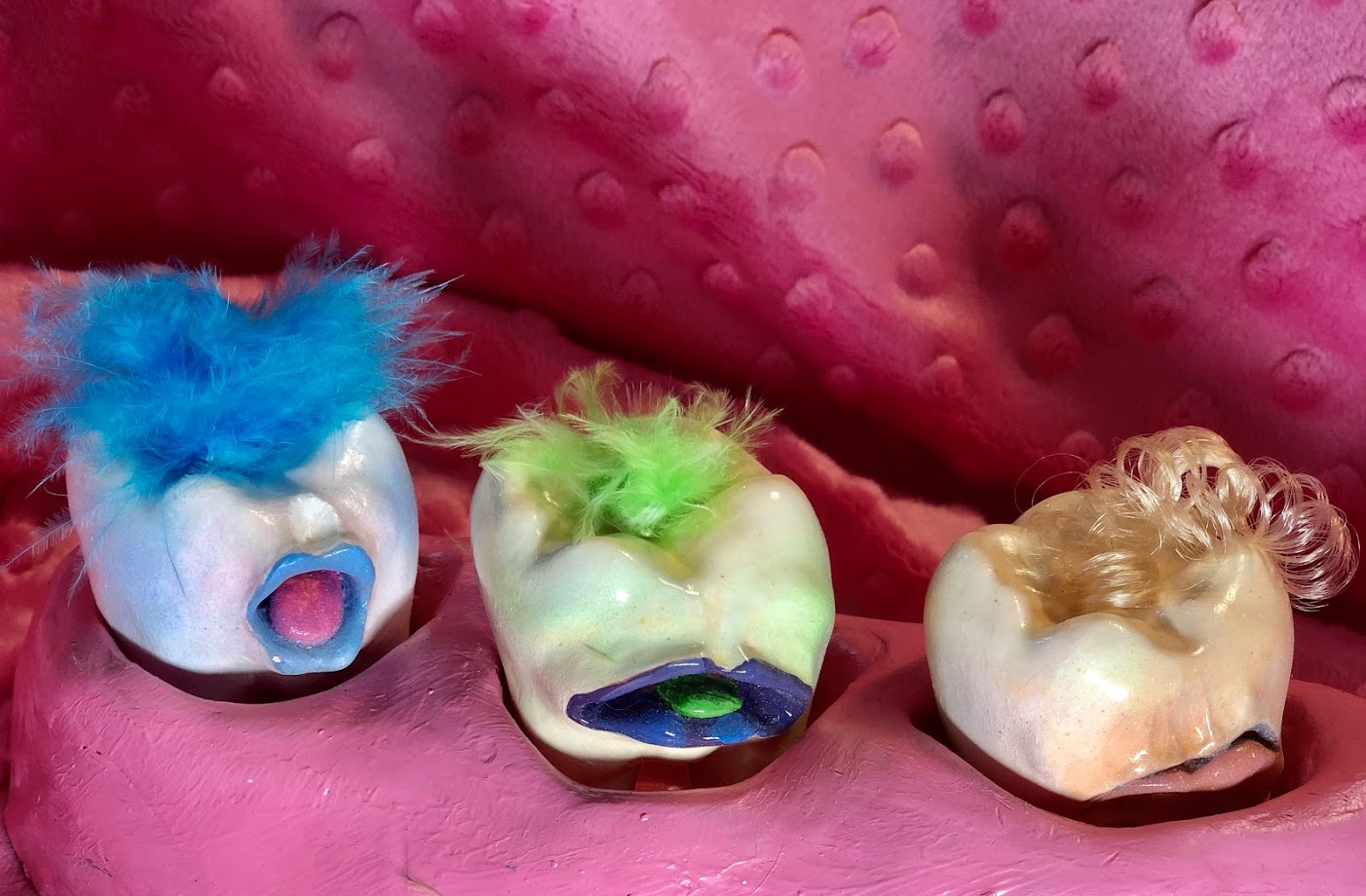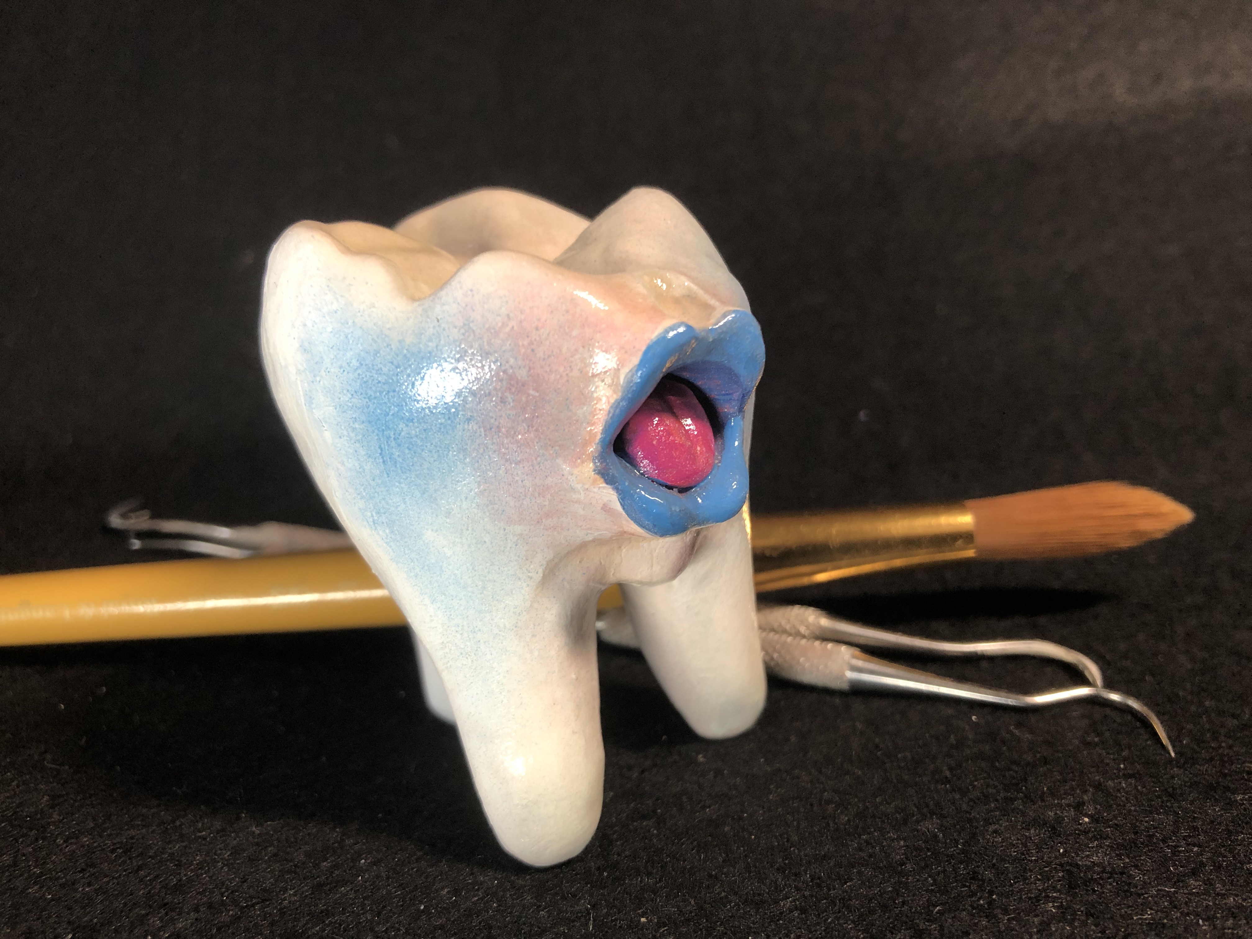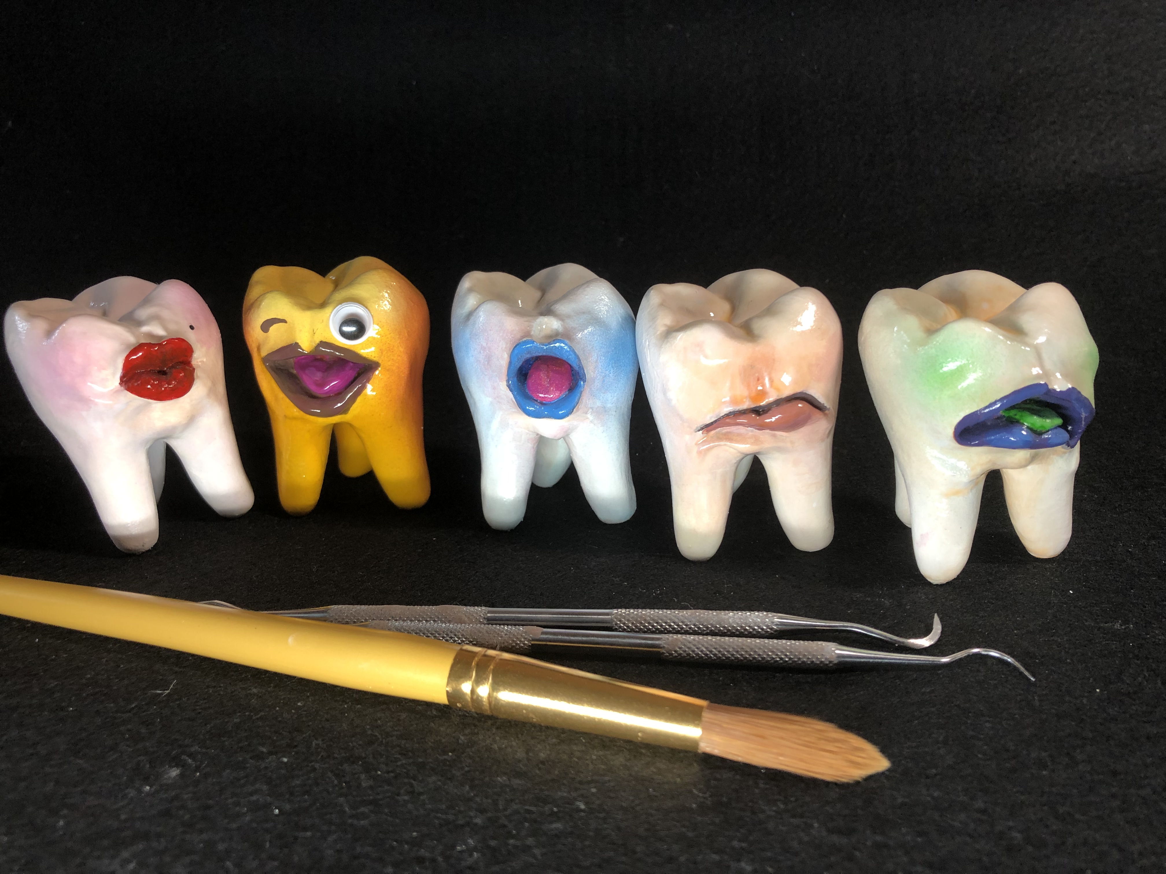 Tiny but mighty loud, "JabberJaw" is from the mighty molar original art series. He stands 2.5in tall, weighs 4oz and comes in a beautiful custom glam gold box perfect for gift-giving. As an artist, I have tremendous fun with these sculptures. They are an expression of my quirky humor and love of theatrical arts. I think of them as art pieces as well as expressive stone puppets. I acquired my knowledge of tooth anatomy working as an Oral Surgeons assistant. I have also always worked as a professional artist. Witness these two worlds colliding resulting in collateral smiles. I sculpted them from clay, made a silicone mold so that I could cast them in sturdy hydro stone. I meticulously hand sand, paint and seal each one. (smiling all the while) I sign each piece at the furcation of the roots under the crown surface. I enjoy placing them in different situations around their environments. They are sturdy enough for the yard, the house, or office, and love the cameras attention for social media memes. These little works of art make wonderful gifts. For some weird reason, it’s fun to pick them up and hold their surprising weight in your hands. Recently I find adding little touches to their enamel wardrobe even more expressive. I hope you will enjoy them as much as I do. I hope to see them around the Net as you create your own little mascots, memes, and unique displays.