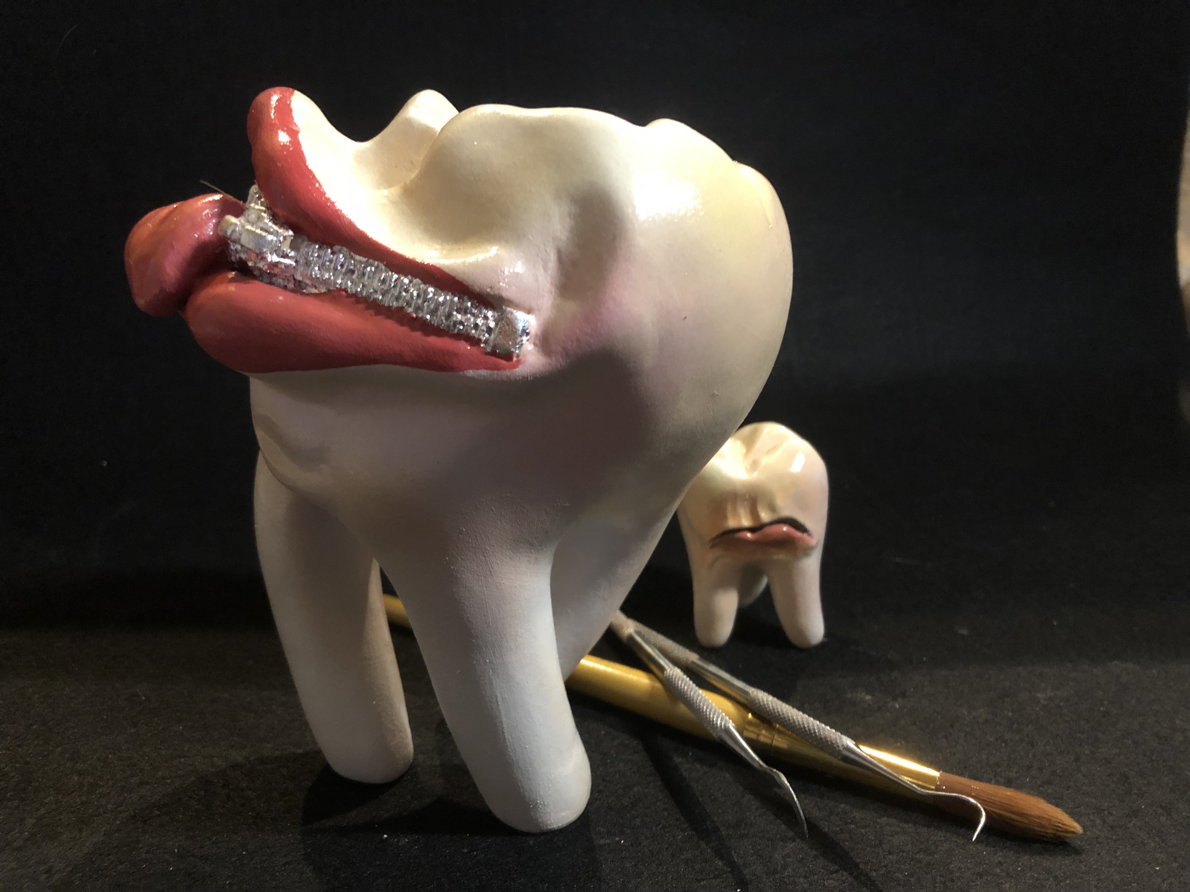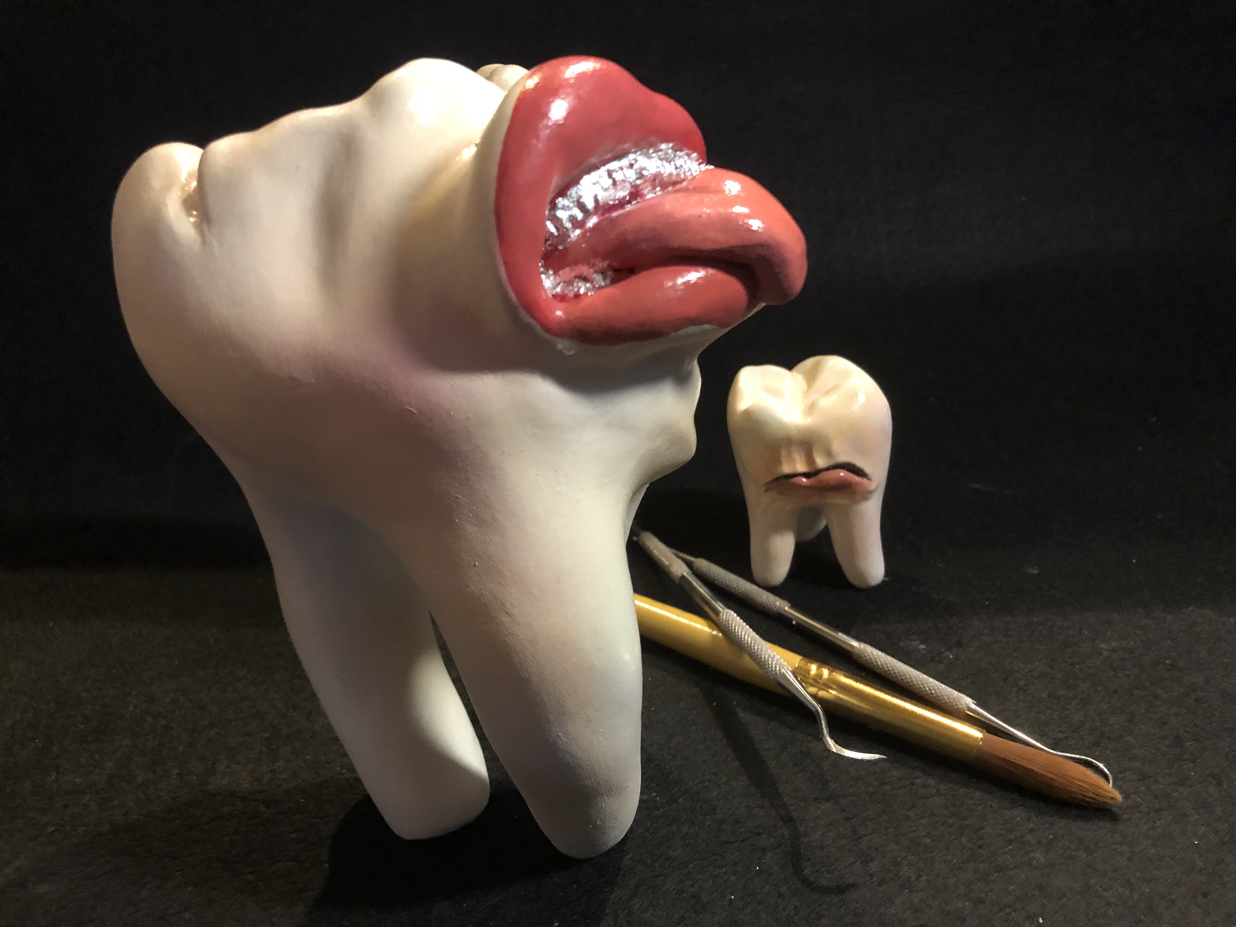 "Zip It" From the whimsical Monster Molar limited art series - is a big boy at 2.5 pounds, 7 inches tall, 13 inches around (more or less). As an artist, I have tremendous fun with these sculptures. They are an expression of my quirky humor and love of theatrical arts. I think of them as art pieces as well as expressive stone puppets. I acquired my knowledge of tooth anatomy working as an Oral Surgeons assistant. I have also always worked as a professional artist. Witness these two worlds colliding resulting in collateral smiles. I sculpted them from clay, made a silicone mold so that I could cast them in sturdy hydro stone. I meticulously hand sand, paint and seal each one. (smiling all the while) I sign each piece at the furcation of the roots under the crown surface. I enjoy placing them in different situations around their environments. They are sturdy enough for the yard, the house, or office, and love the cameras attention for social media memes. These little works of art make wonderful gifts. For some weird reason, it’s fun to pick them up and hold their surprising weight in your hands. Recently I find adding little touches to their enamel wardrobe even more expressive. I hope you will enjoy them as much as I do. I hope to see them around the Net as you create your own little mascots, memes, and unique displays. Height: 7 Inches; Width: 13 Inches; Depth: 6 Inches