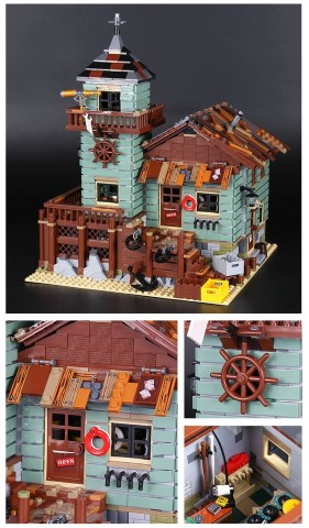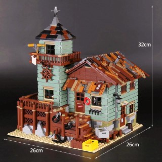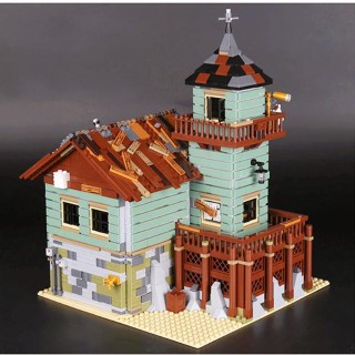 Old Fishing Store features a detailed exterior, shop and connected lookout tower with office, all standing on a sand-coloured 32x32 baseplate with rock-style elements.