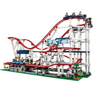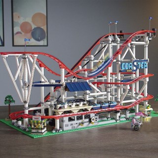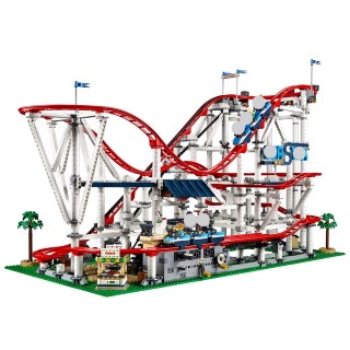 Fully functional chain-lift Roller Coaster model features a classic brick-built sign, control panel, 2 trains—each consisting of 3 train cars with low-friction wheels, and a 44-piece track consisting of 7 different rail elements.