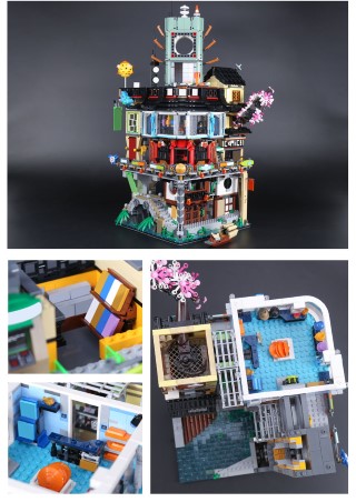 Level 3 features a radio tower, modern rooftop sushi bar with sushi conveyor belt function and brick-built food, bathroom with sliding door, and brick-built puffer fish and squid sculptures, Lloyd Garmadon and Misako's apartment with an opening window, bunk bed, kitchen unit and attic space for the Green Ninja Suit mini-figure.