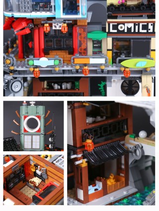 Level 2 features a modern fashion store with 2 mannequins and assorted NINJAGO product elements, a construction site with a bonsai tree, a comic book store with brick-built sign, cashier desk, comic book stand with assorted elements including collectible NINJAGO training cards, a crab restaurant with brick-built crab entrance sign and oven with ‘crab-grilling’ function, a cash-dispensing ATM, 15 bank note elements (ATM can dispense up to 13), and a movie poster display stand with 4 interchangeable movie poster elements.