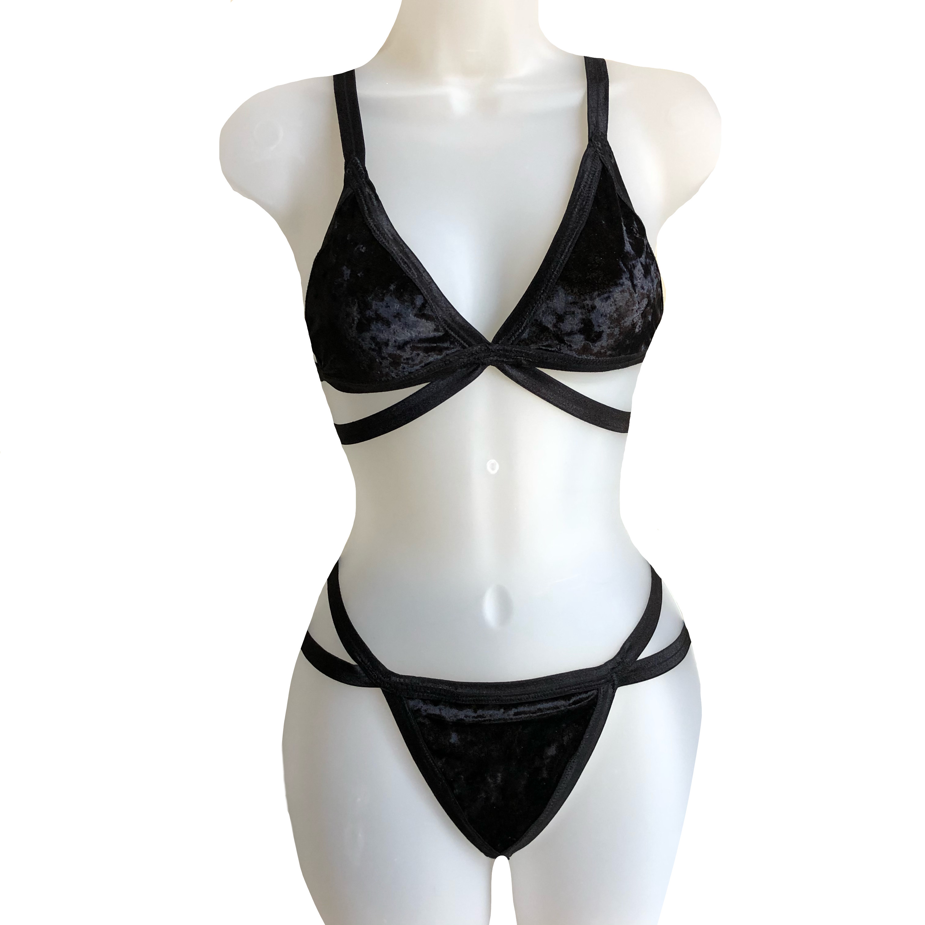 Soft and stretchy set made out of a soft & panne velvet. Lounge around the house in this set or wear it any day! Size Measurements Bralette XSmall: bust 28”-30” Small: bust 32”-34” Medium: bust 36”-38” Large: bust 40”-42” XLarge: bust 44”-46” Panty XSmall: waist 22”-28” Small: waist 26”-32” Medium: waist 30”-36” Large: waist 34”-40” XLarge: waist 38”-44”