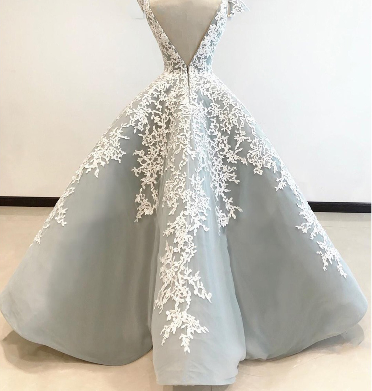 Gray organza v neck long puffy evening dress, prom dress with applique,SB2286-1