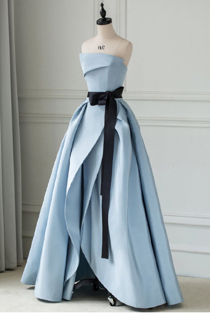 LS0129,beautiful light blue sleeveless strapless prom dress,satin evening dress-1