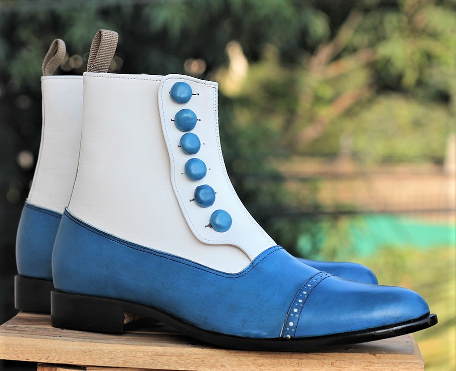Button Top Ankle High Blue & White Men's Leather Boots-2