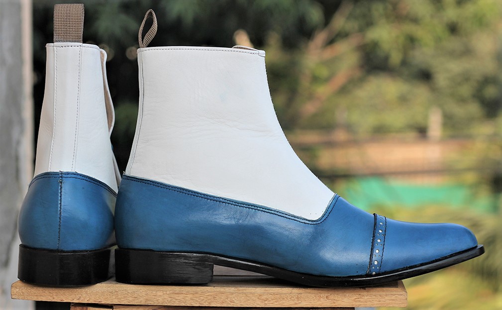 Button Top Ankle High Blue & White Men's Leather Boots-4