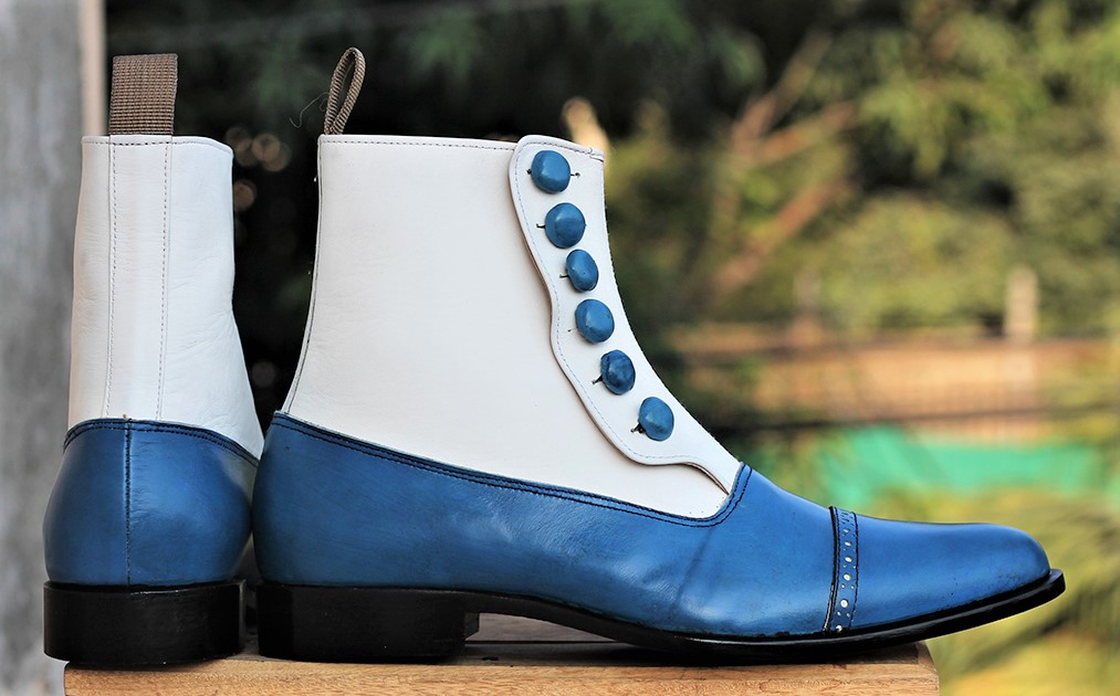 Button Top Ankle High Blue & White Men's Leather Boots-3