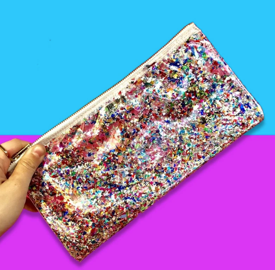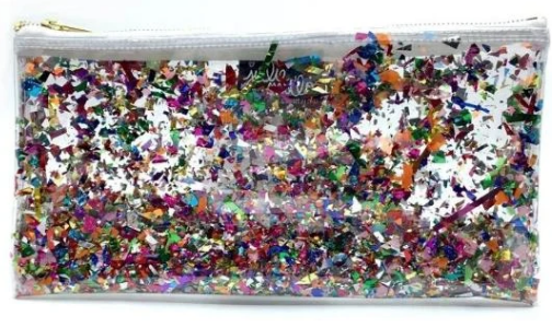 A rainbow confetti filled CLEAR vinyl clutch that's super fun and always party-ready! Show up to parties and expect to have all eyes on you with this confetti bag under your arm... or forget the party and just bring the party around with you with this party pouch! 11x5.5" 11" brass metal zipper