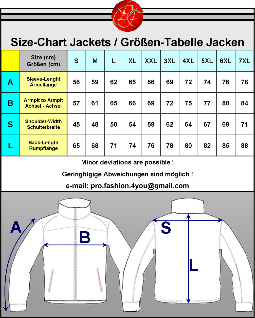 Please take one of your clothes that suits you well, measure and then compare with our size charts. Measure your jacket (clothes), not your body !
