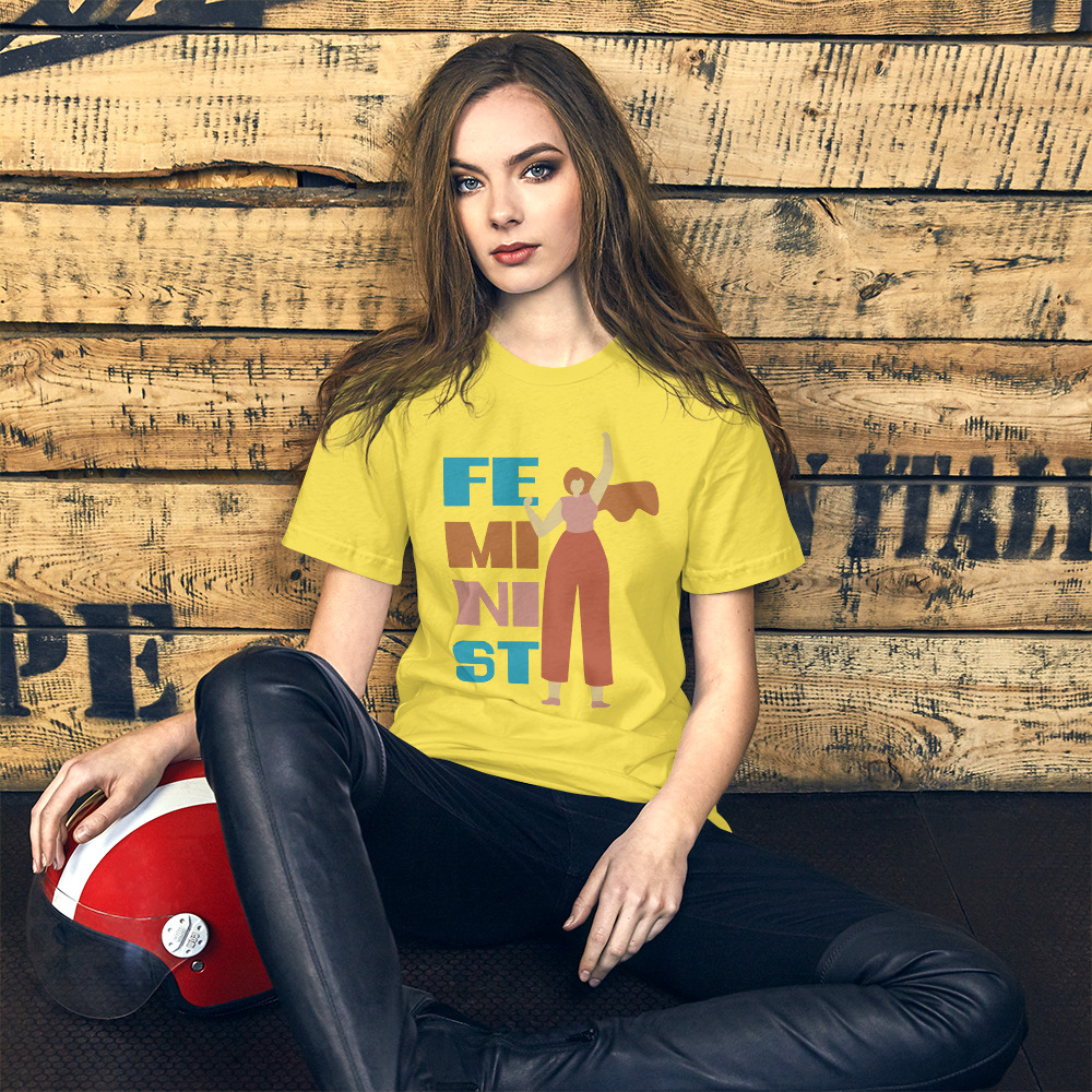 FEMINIST Short-Sleeve Unisex T-Shirt by McCalla Coulture: Femininities Collection. This t-shirt is everything you've dreamed of and more. It feels soft and lightweight, with the right amount of stretch. It's comfortable and flattering for both men and women. • 100% combed and ring-spun cotton (heather colors contain polyester) • Fabric weight: 4.2 oz (142 g/m2) • Pre-shrunk fabric • Shoulder-to-shoulder taping • Side-seamed