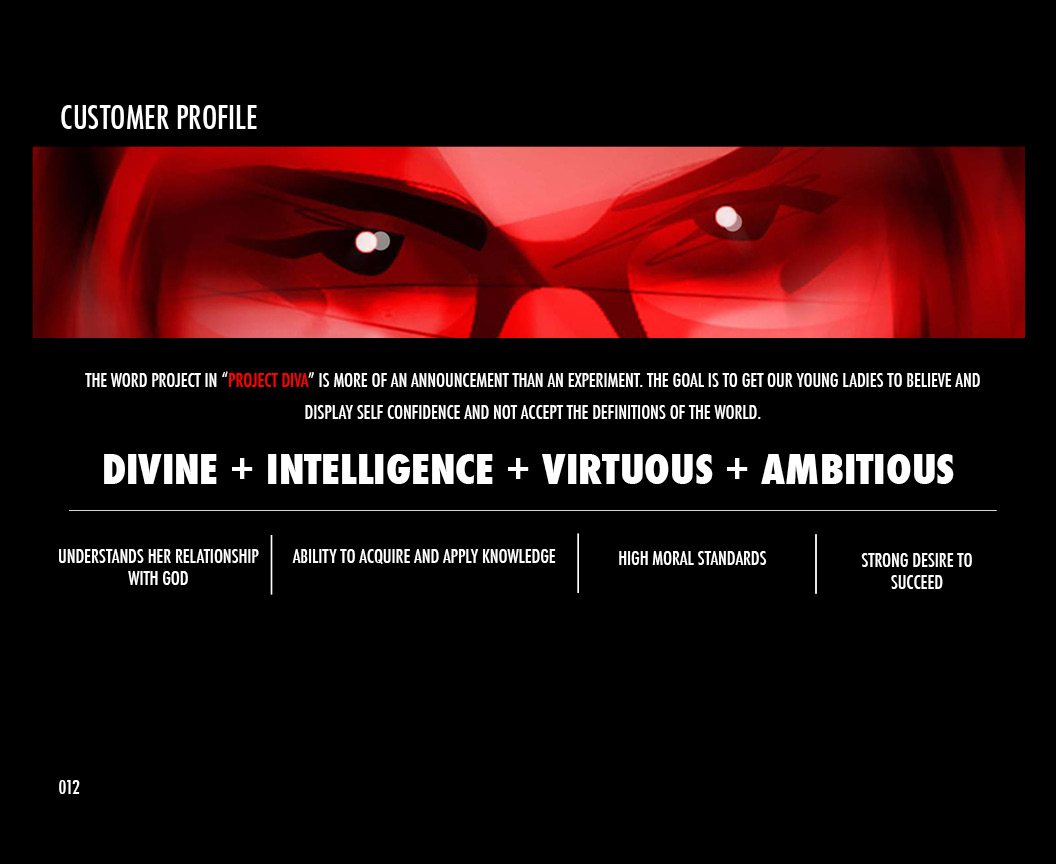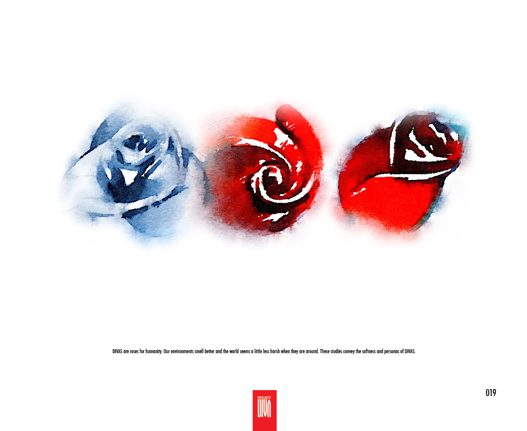 ProjectDIVA is an art book that starts with a layout of a customer profile, followed by a series of floral studies, logo development, fashion design, transportation design and culminates with final illustrations of a social heroine that defies modern estimations.