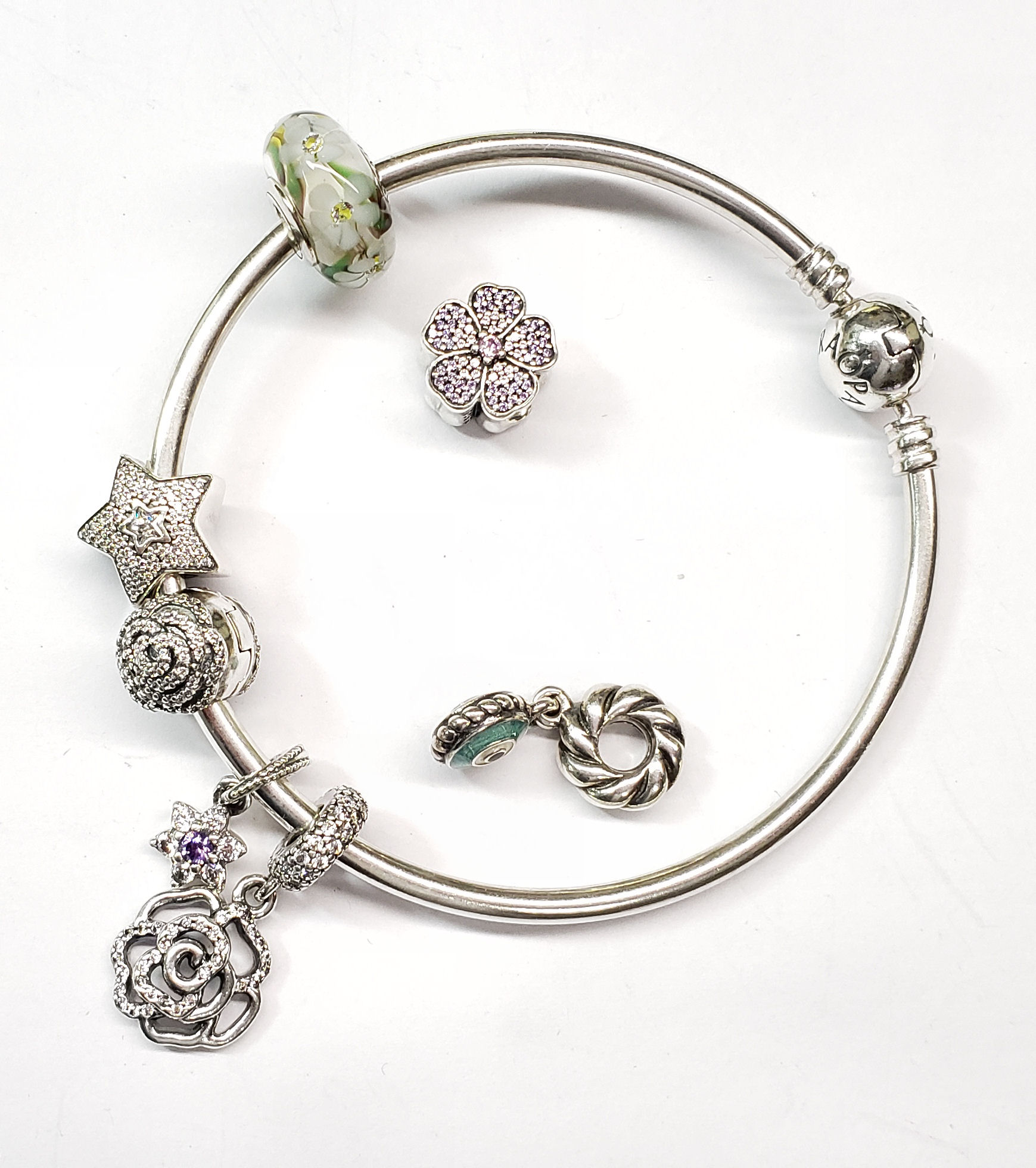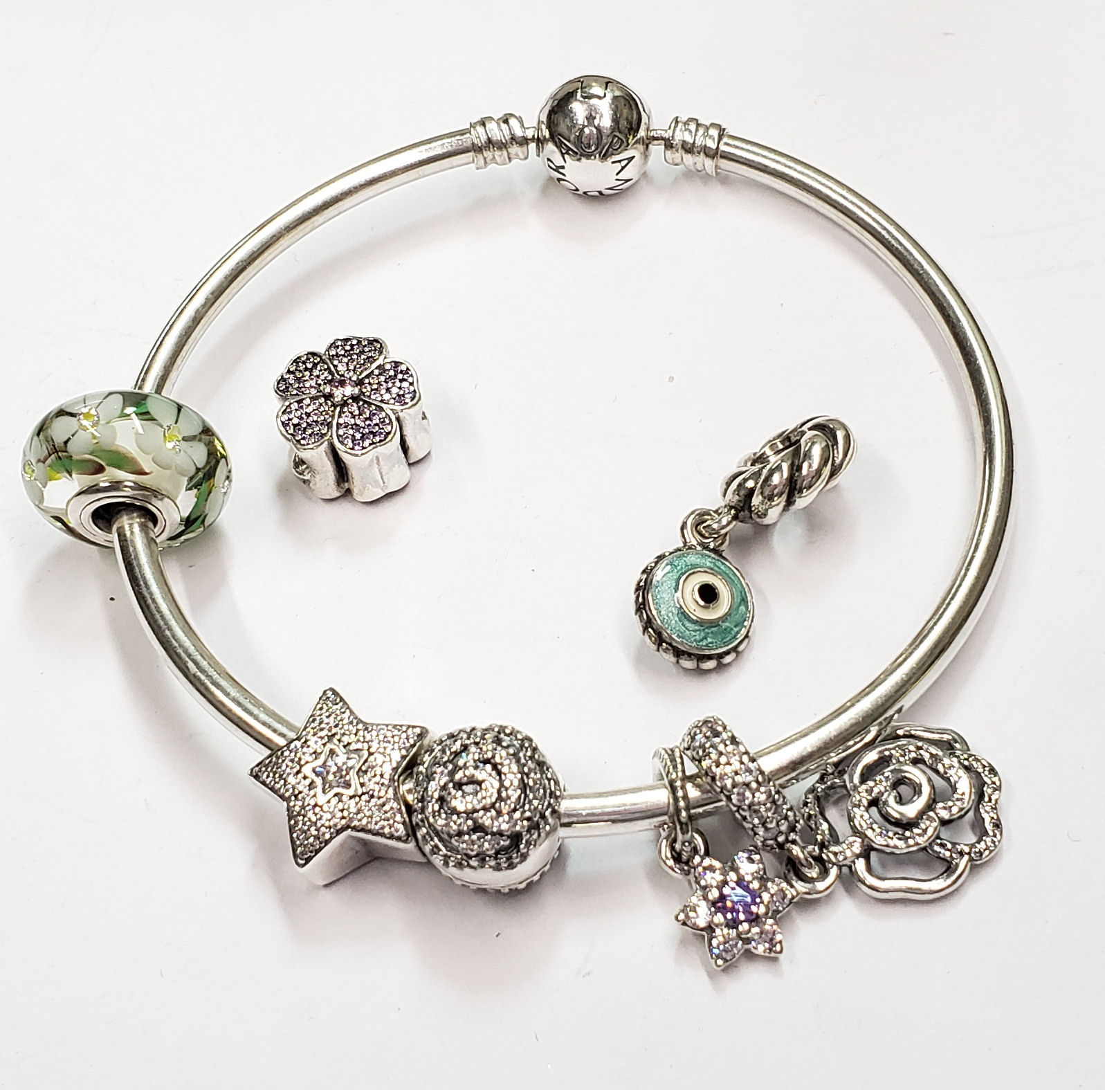 Pandora sterling silver hollow bangle bracelet 3mm wide, with 6 detachable charms included in purchase. They are all sterling silver , most have cubic zirconias set in them. The bangle weighs 12 grams without charms. All pieces are stamped as pandora charms are: Swirl of cubic zirconia Wishing star Shimmering Rose CZ Watchful Eys Sparkling Primrose pink & purple Forget me knot purple