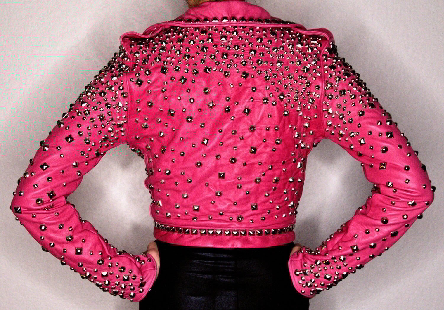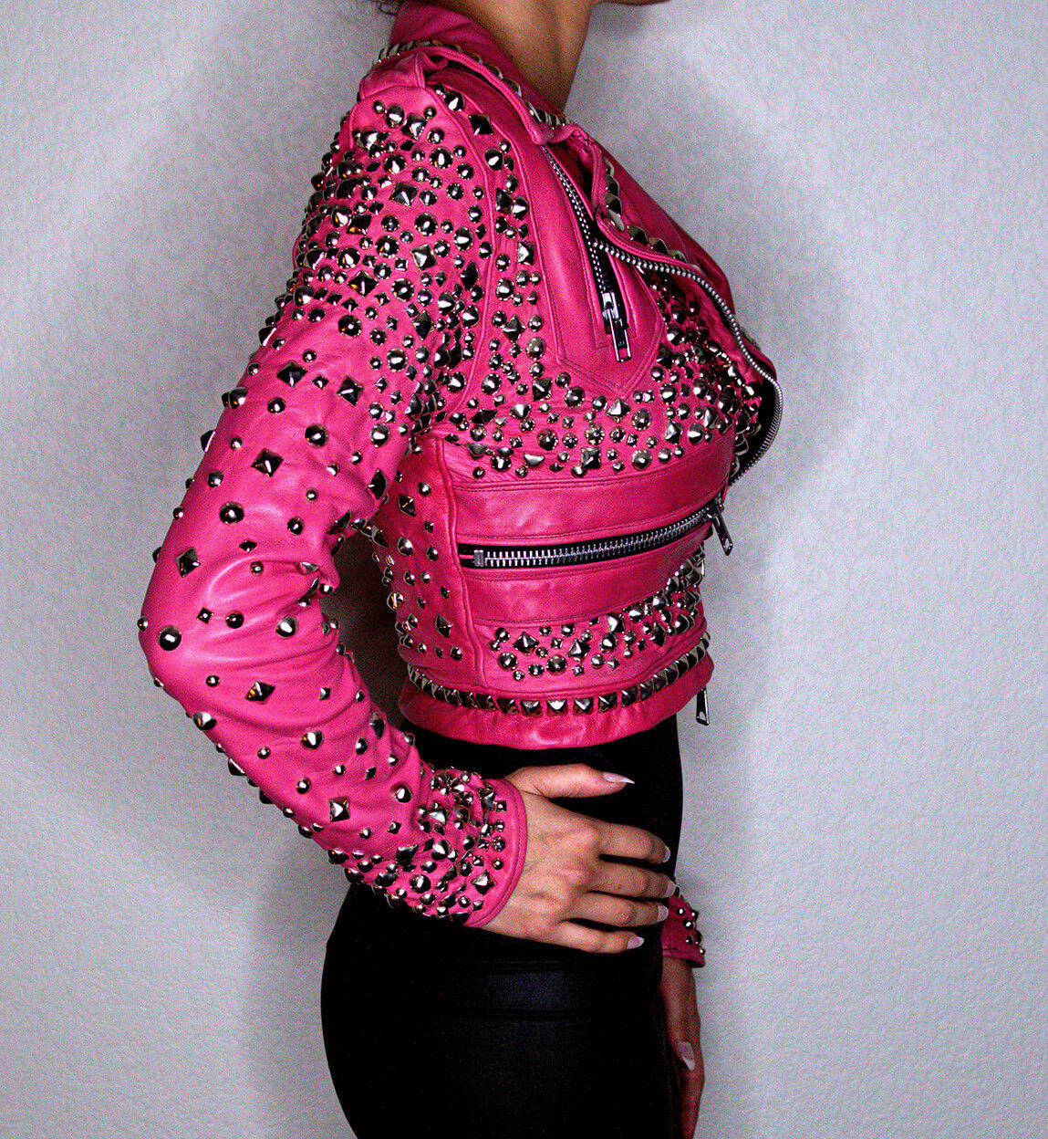 Handmade Women's Pink Full Silver Studded Brando Punk Cowhide Leather Motorcycle Jacket