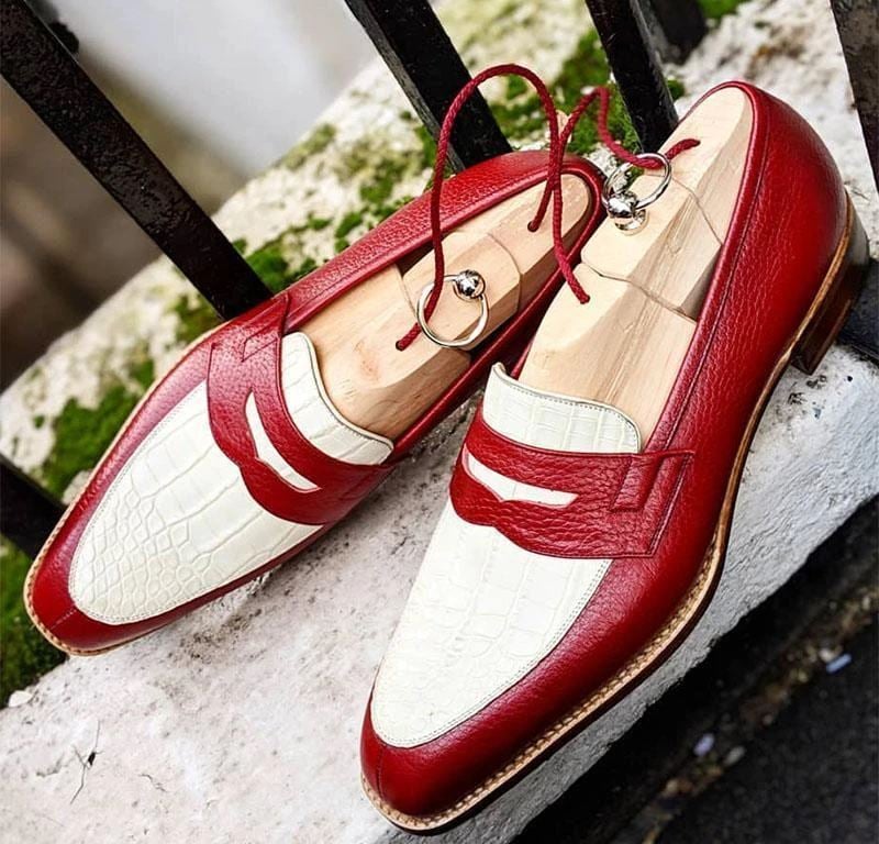Pure Handmade Burgundy & White Alligator & Pebbled Leather Penny Loafers Shoes For Men's