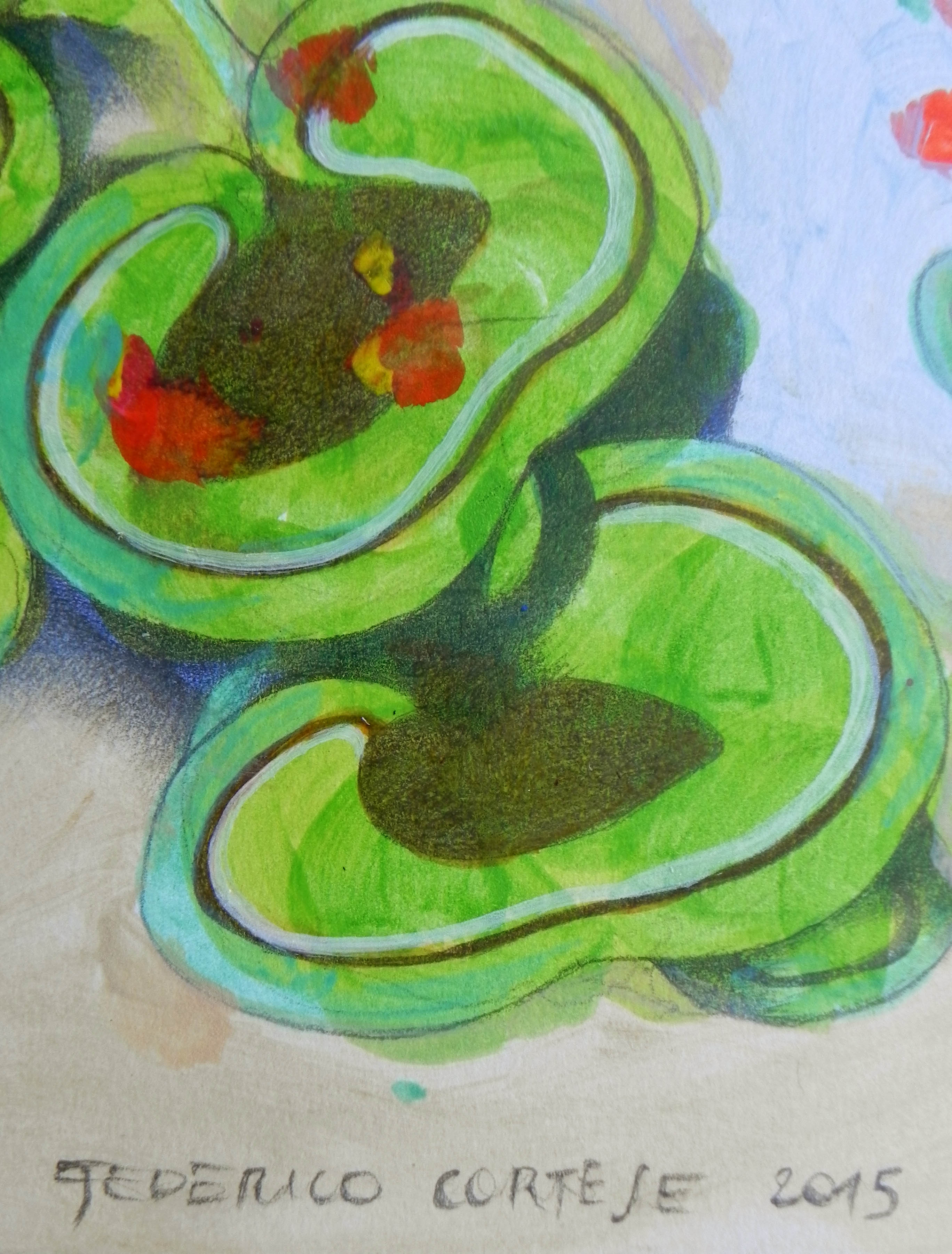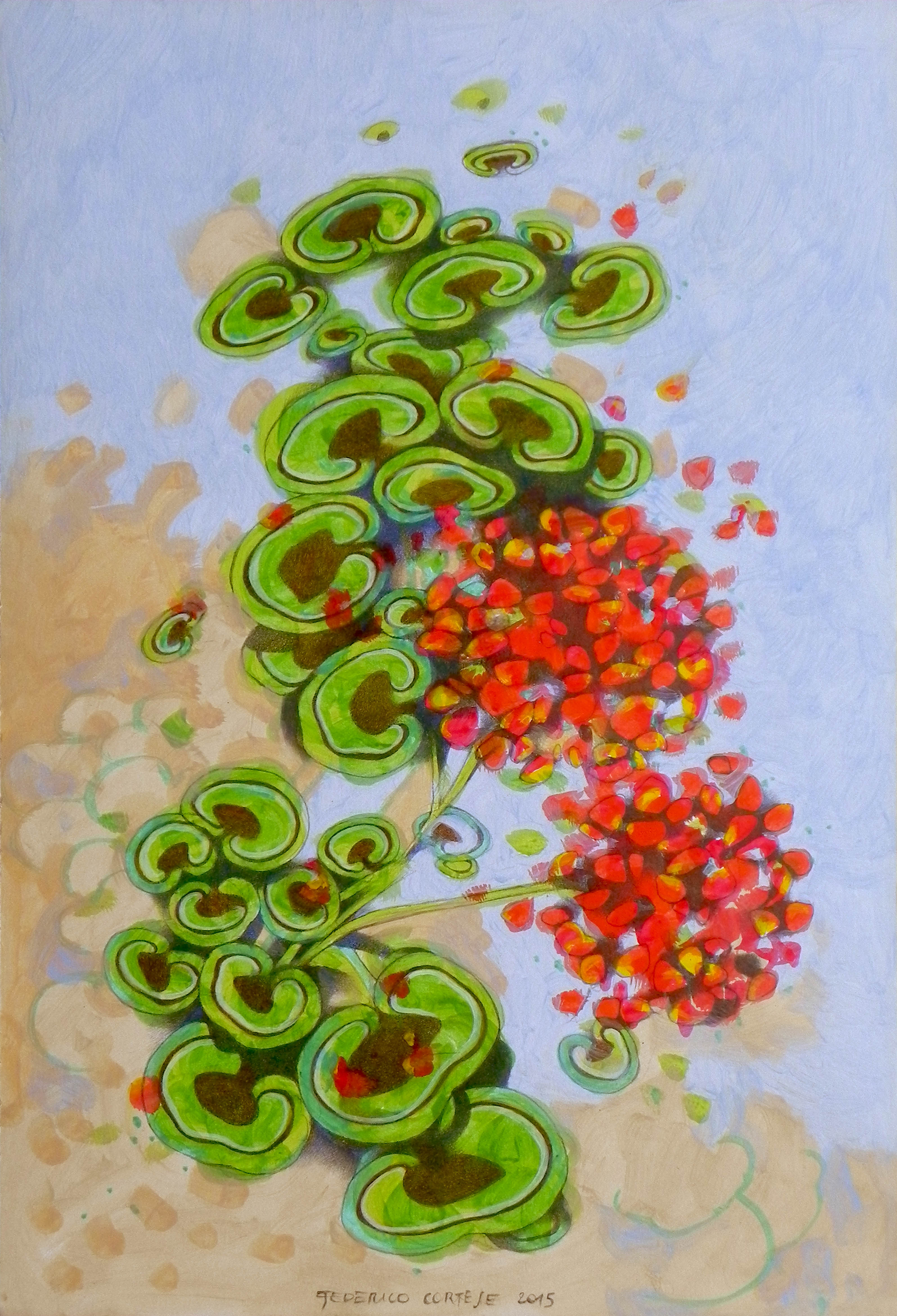 Summary of features: Artist: Federico Cortese Title: Geraniums Quantity: 1 Conditions: excellent Medium & materials: oil and pencil on thick paper Dimensions: 30 x 44 cm (11.8 x 17.3 in) Location and year created: Turin, Italy - 2015 Certificate of Authenticity: included, with signature of the artist on photograph Signed: on the front, bottom center Surface of the paper: smooth FREE SHIPPING WORLDWIDE! An original piece from the series “Botany’s notebook”: These are the plants that I grow on my balcony. I have a small balcony with a few pots of flowers, and these are the things I see more when I'm sitting at my desk, and every time I look up from the drawing I'm doing, out of the window, this is what I see. I get distracted, but the distraction brings me right back to the need to draw, so I take another piece of paper and try to sketch the plants, their colors, the shadows and the light reflections dancing on their leaves. When I go back to the work I was previously doing, a little bit of these sketches is transferred into it, and this tells me that my drawings (my thoughts), though apparently distant and very different from each other, talk, communicate and transmit the information all together.