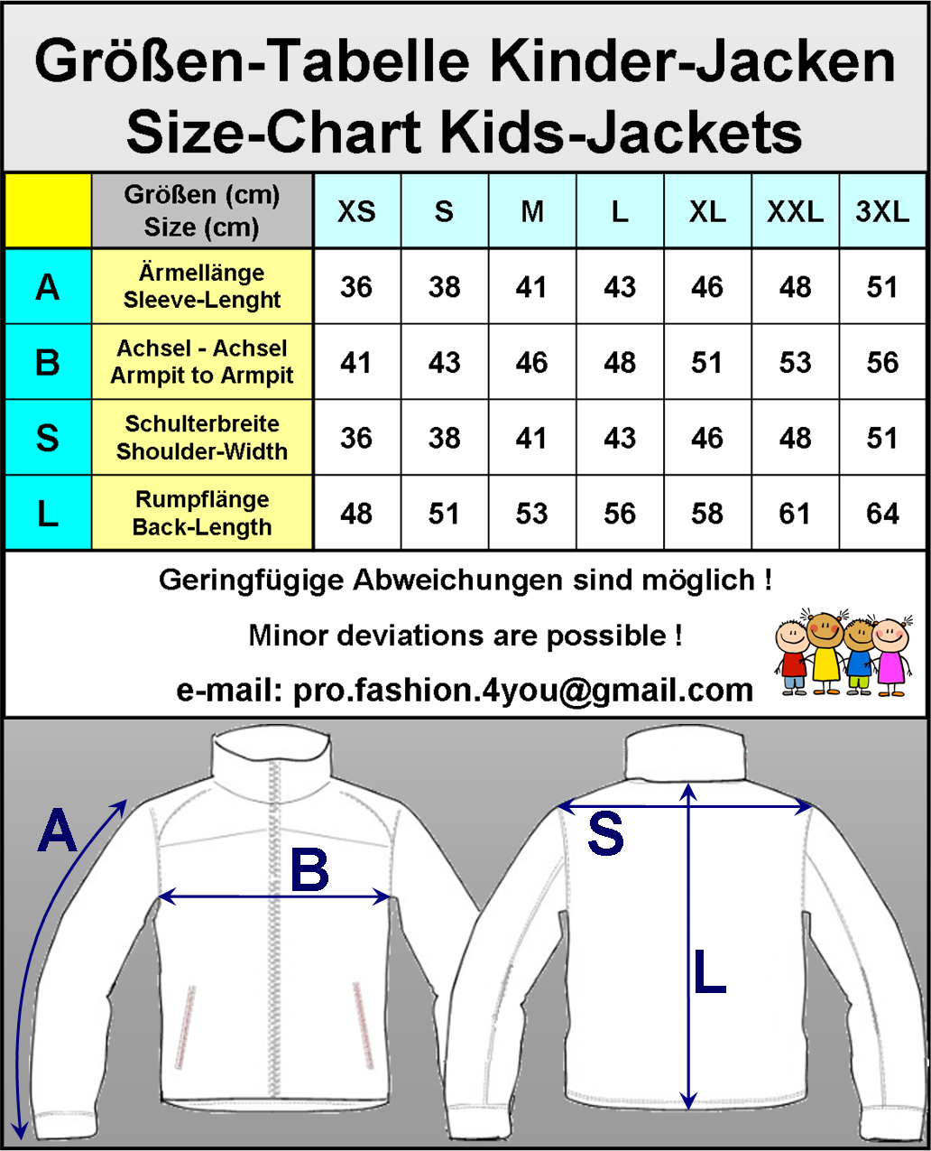 Please take one of your clothes that suits you well, measure and then compare with our size charts. Measure your jacket (clothes), not your body !