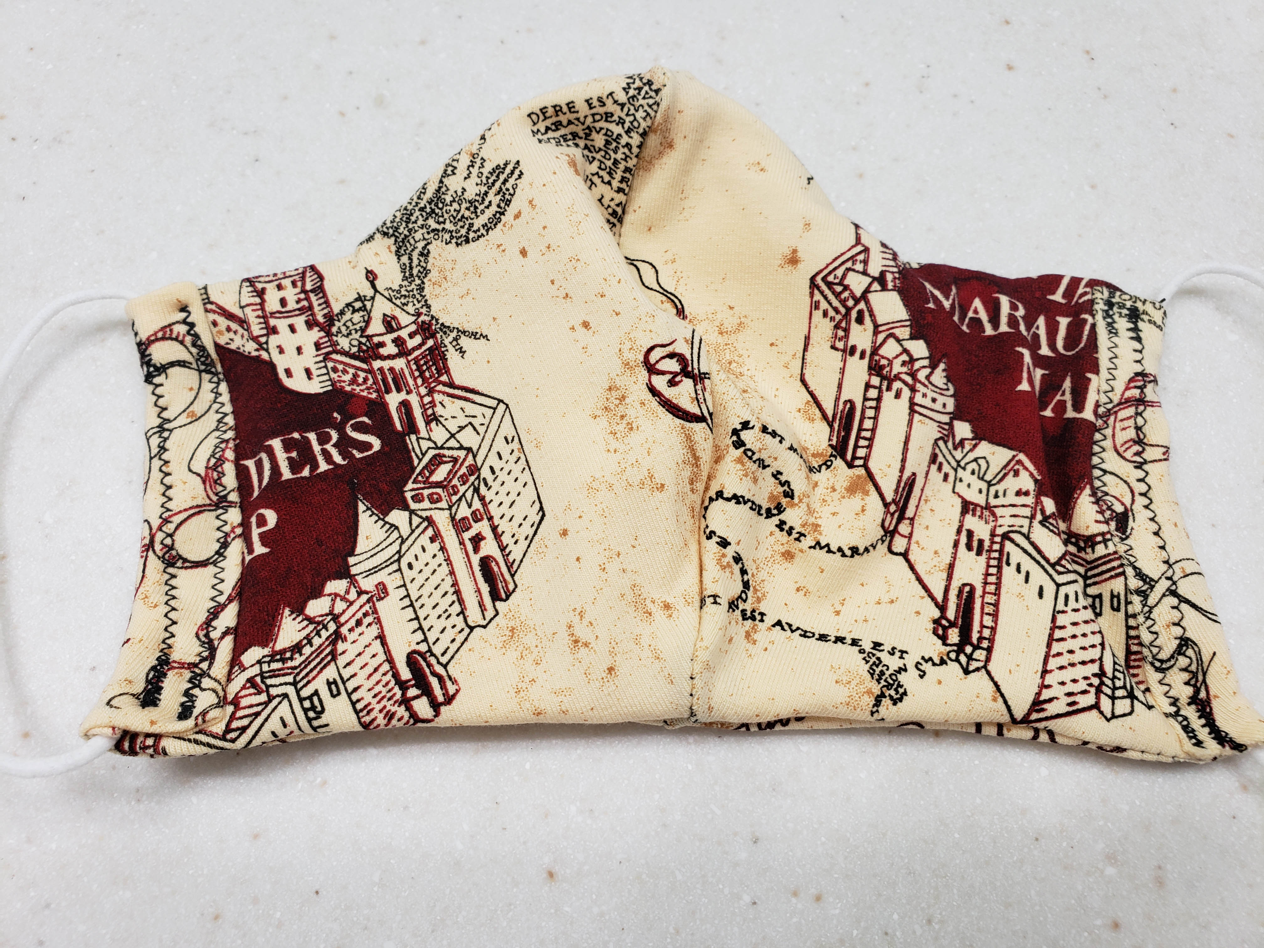 Handmade Facemasks crafted from fabric containing 100% cotton. This face mask features a Harry Potter Marauder's Mask Design that is Reversible.