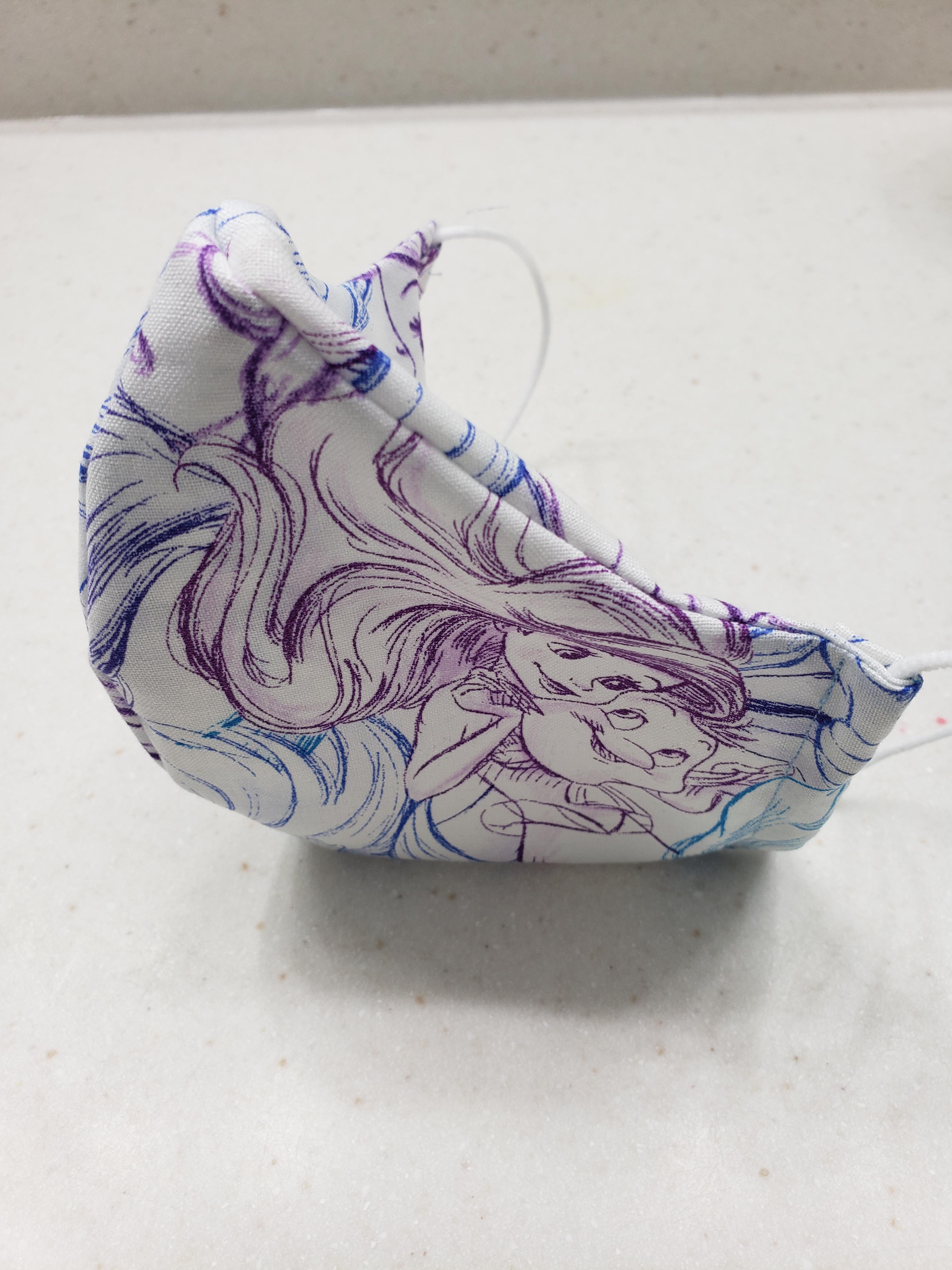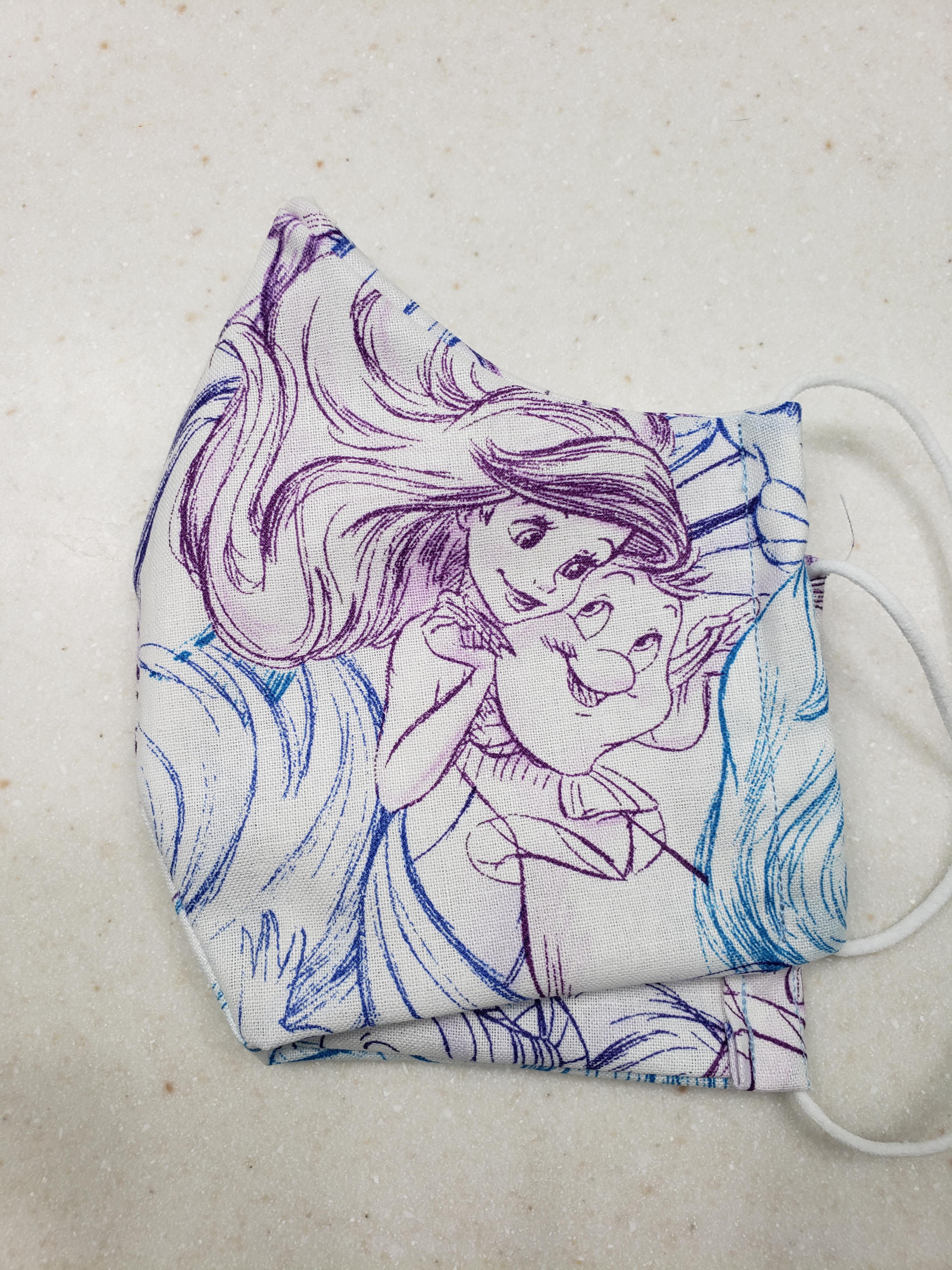 Handmade Facemasks crafted from fabric containing 100% cotton. This face mask features a Disney Sketched Ariel Design.