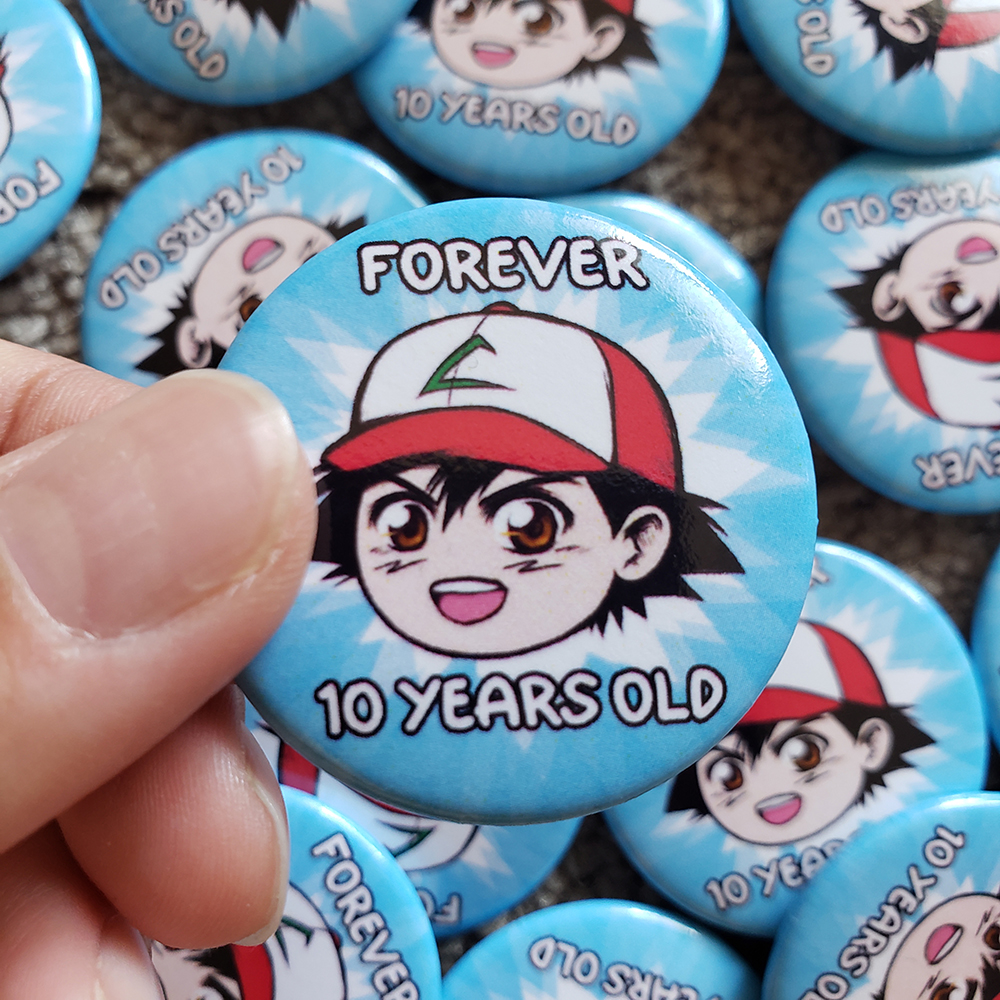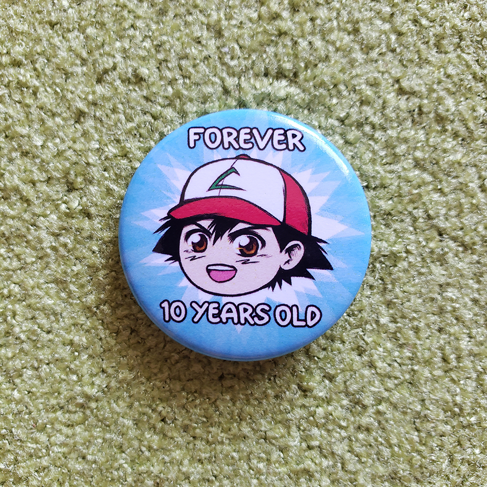 A button of Ash Ketchum "Forever 10 Years Old. ✰1.5 inches