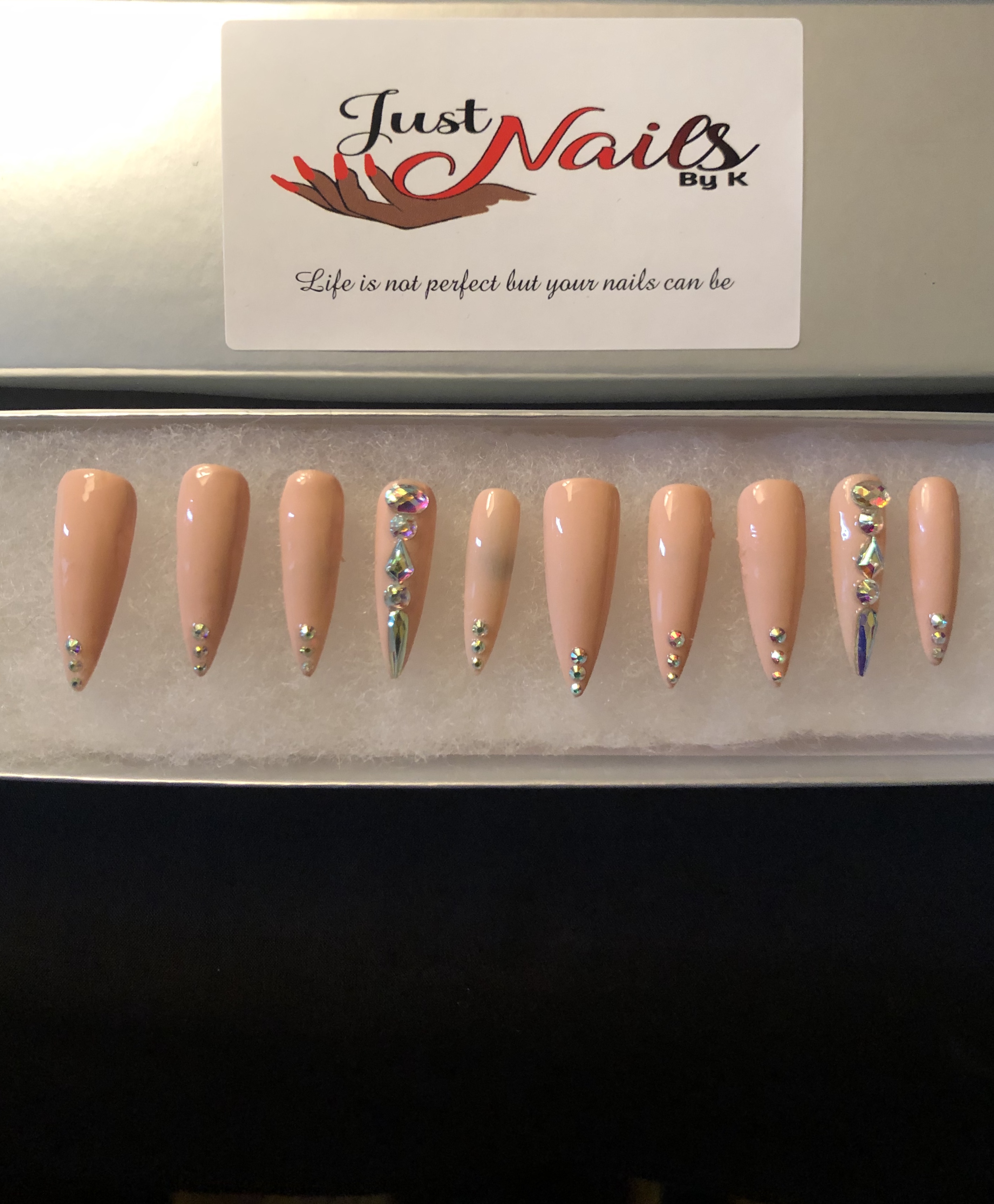 Nude press on nails with rhinestone accents. Set of 10 Nails *High quality Durable Tips. Looks like acrylics! *They will last 2-3 weeks with proper nail prep and care. *Hand-painted with 2-3 coats of high quality gel polish and a gel topcoat cured with a strong LED light. All nails are made to order and hand painted by me. Due to the hand made nature of these nails, there will be slight differences between your set and those in the photos If you would a custom color. Please email to discuss. Package includes: 1 Full Size Nail File 1 Cuticle Pusher 1 Prep Pad 1 Nail Glue Don’t know your size? Check out my sizing guide chart or purchase my nail sizing kit. • DISCLAIMER • Different display monitors may slightly distort the lighting and color of the photos. When checking out please write your desire color and finish in the note section. If your nails don’t match the pre-determined sets, just select CUSTOM and leave your sizes in the note section at checkout. Example ------------- Thumb: 2 Pointer: 5 Middle: 6 Ring: 7 Pinky: 9