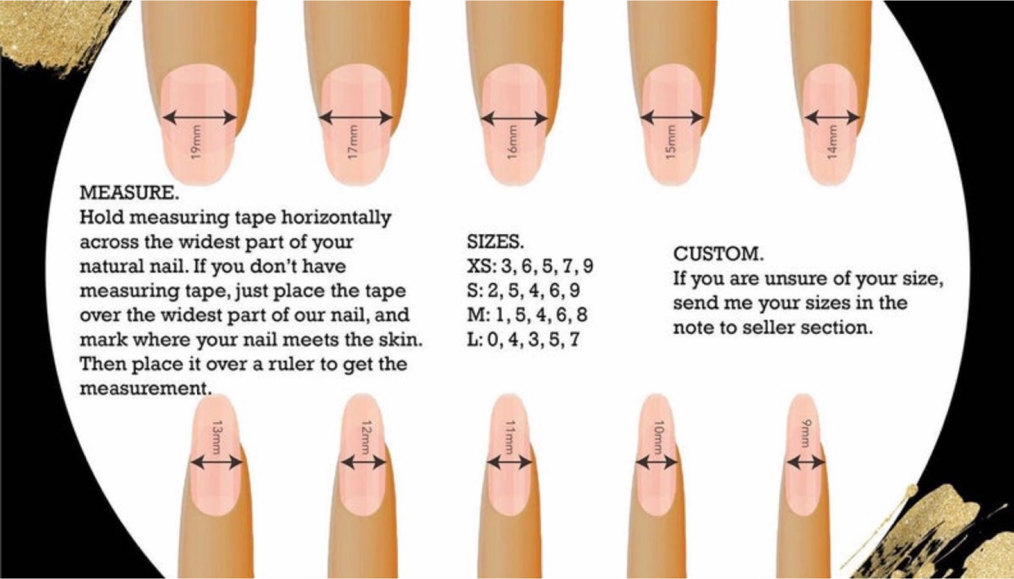 Hold the measuring tape horizontally across the widest part of your natural nail (use millimeters) and write number down for each nail.