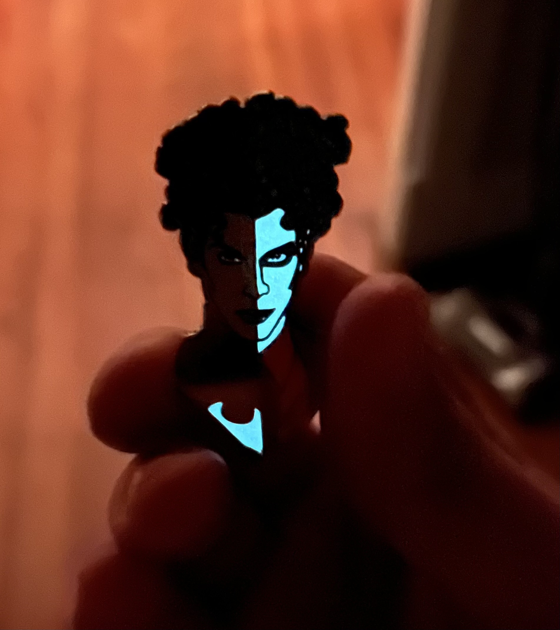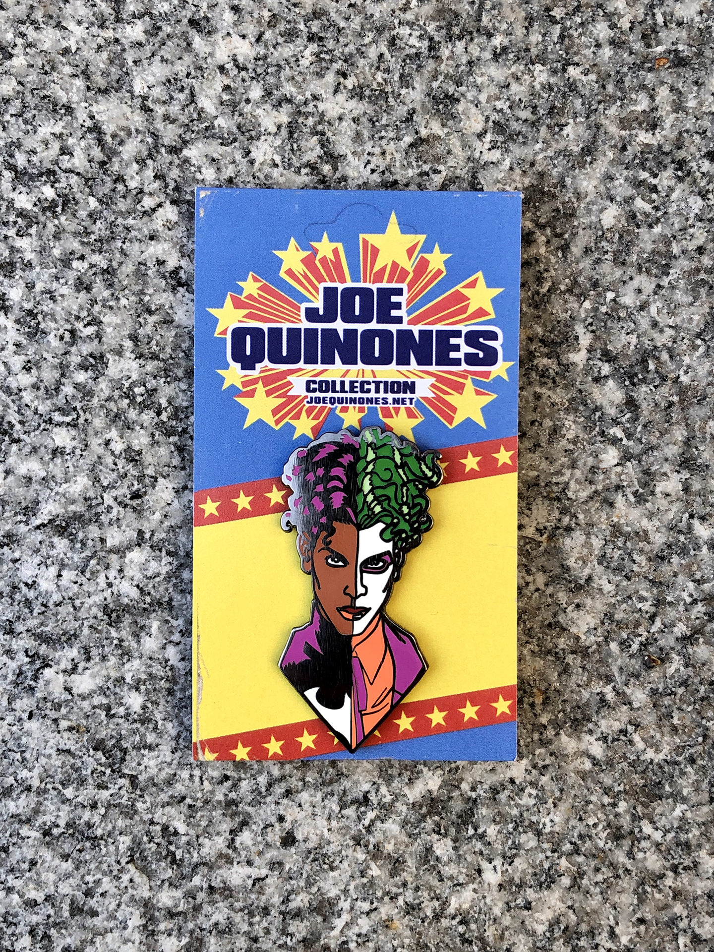 An original enamel pin design by Joe Quinones. Pin glows in the dark, fastened with two rubber clasps and comes with a complimentary sticker.