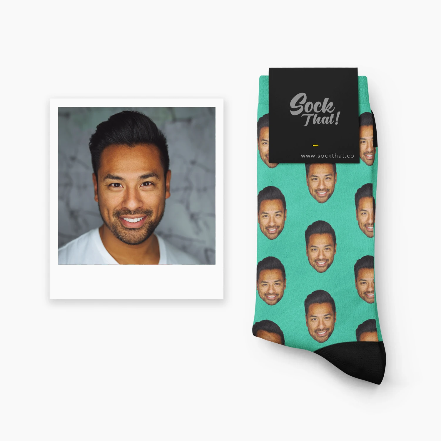 These face socks are all about your beaming faces and cheeky grins. Send us an awkward picture of your friend sporting an unfashionable haircut from their youth and we'll stick it on a sock. Deliver us a photograph of your face: the other half will appreciate the gift of your golden good looks stitched into the fabric of a fashionable sock. Socks with a face on are the perfect Christmas or birthday present, or our preferred method of gifting someone socks with faces on: slid into a co-worker's desk on an ordinary Tuesday morning.
