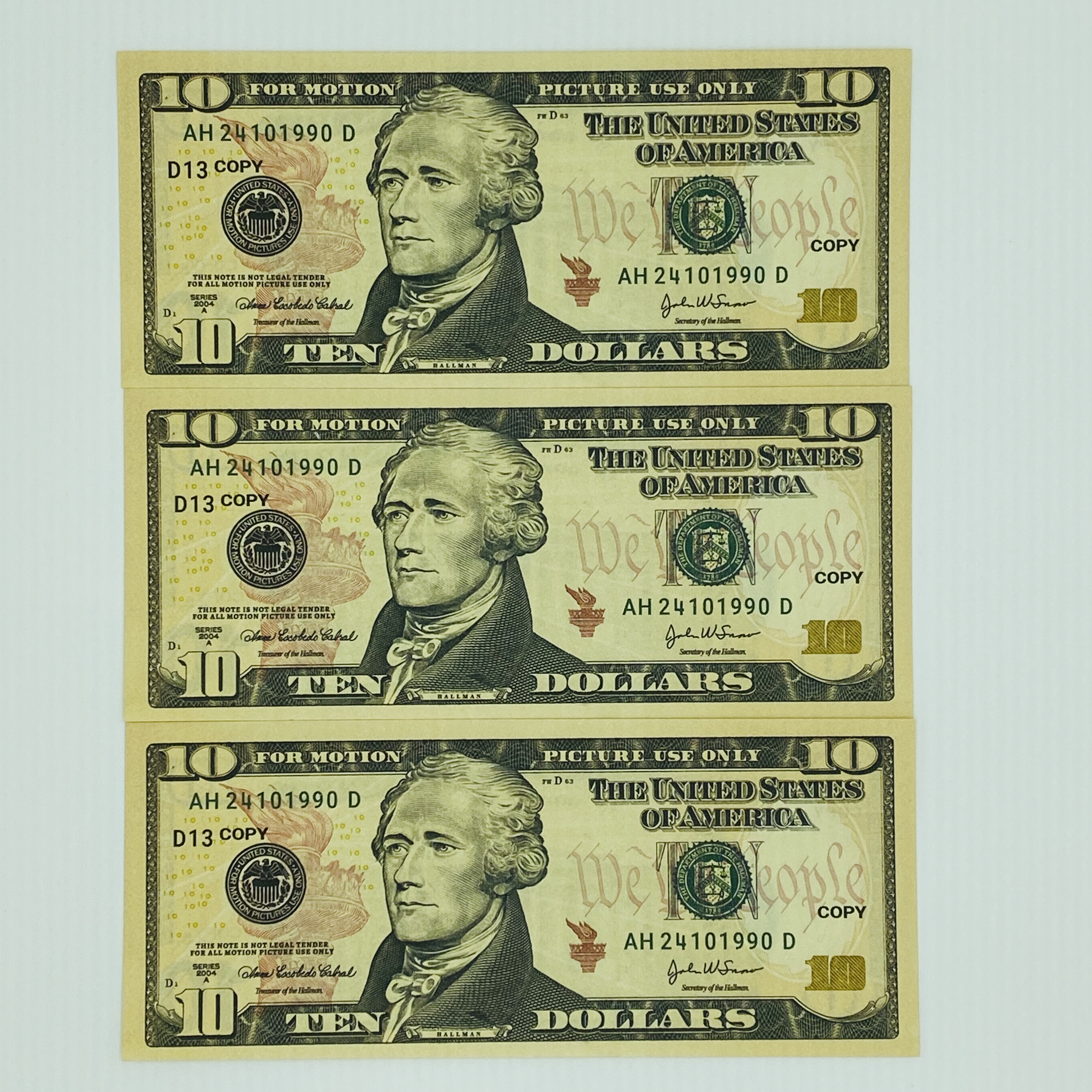 • Prop money does not contain any of the embedded security features. Items are designed not to imitate the exact texture of authentic bills due to legal restrictions.
