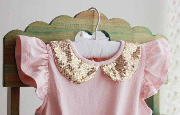 This adorable dress features a pink top, navy tutu bottom and gold sequined collar.