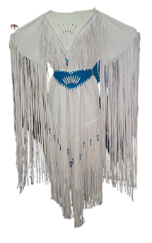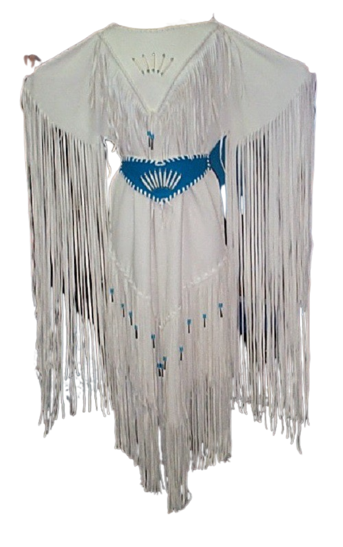 Woman's White Buckskin Long Fringes With Blue Belt Wedding Dress Powwow Regalia ED06-2