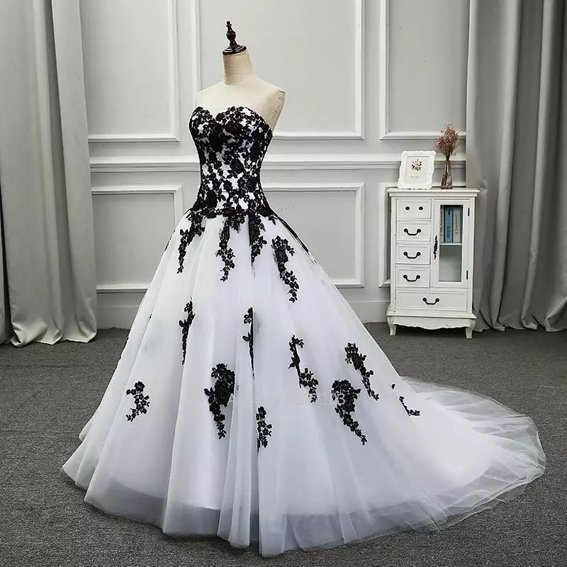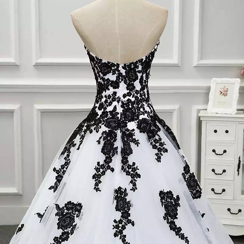 Any question,welcome to contact [email protected] No. 2, About The Details Of The Dresses Silhouette:Ball Gown Material:Tulle Embellishment:Lace Appliques Hemline:Court Train Neckline:Sweetheart Sleeve Length:Sleeveless Back Details:Lace Up Body Shape: All Sizes Shown Color: White and Black or custom made color 3, Size: standard size or custom size, if dress is custom made, we need to size as following bust______ cm/inch waist______cm/inch hip:_______cm/inch shoulder to shoulder :_______cm/inch shoulder to floor without shoes on :_______cm/inch head to floor without shoes on:_______cm/inch 4, Delivery Time: Processing time: 15-22 business days Shipping Time: standard shipping needs 15-60 business days; rush shipping needs 7-10 business days by Fedex , UPS or DHL. 5, Payment: paypal, bank transfer, western union, money gram and so on. 6,Customers Need To Know : All of the dresses are not "on the shelf".We strongly recommend you to select "Custom Made" to ensure the dress will fit you when it arrives. Our tailors will craft each dress to order even for a standard size. 7, Before shipping,the photo of the finished dress will be sent to you for confirmation.