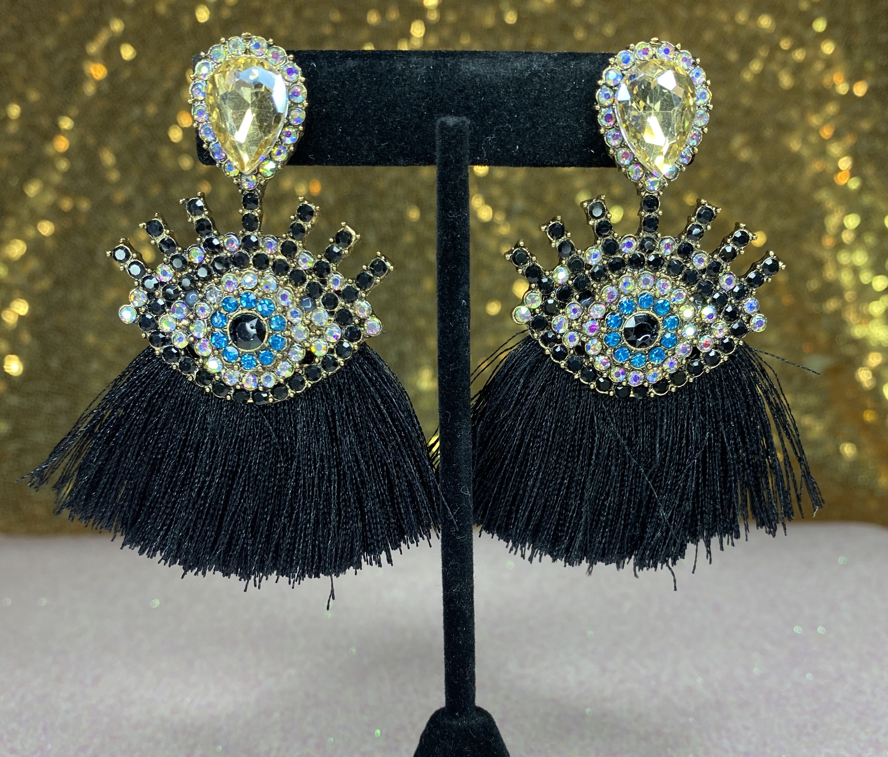 Crystal eye earring with black hanging fringes. 3 in. drop